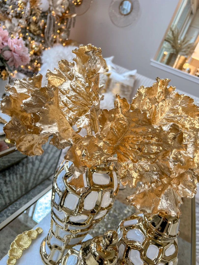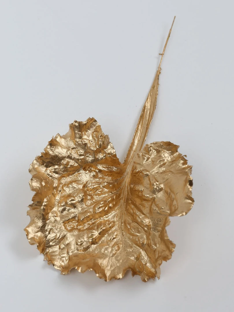 Description: This golden metallic ruffled leaf spray will add a touch of glamour to your holiday displays or floral arrangements all year round!