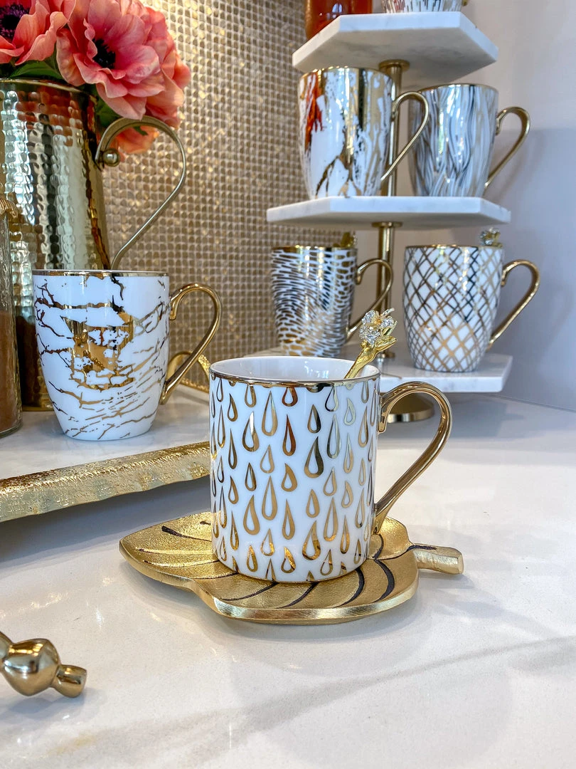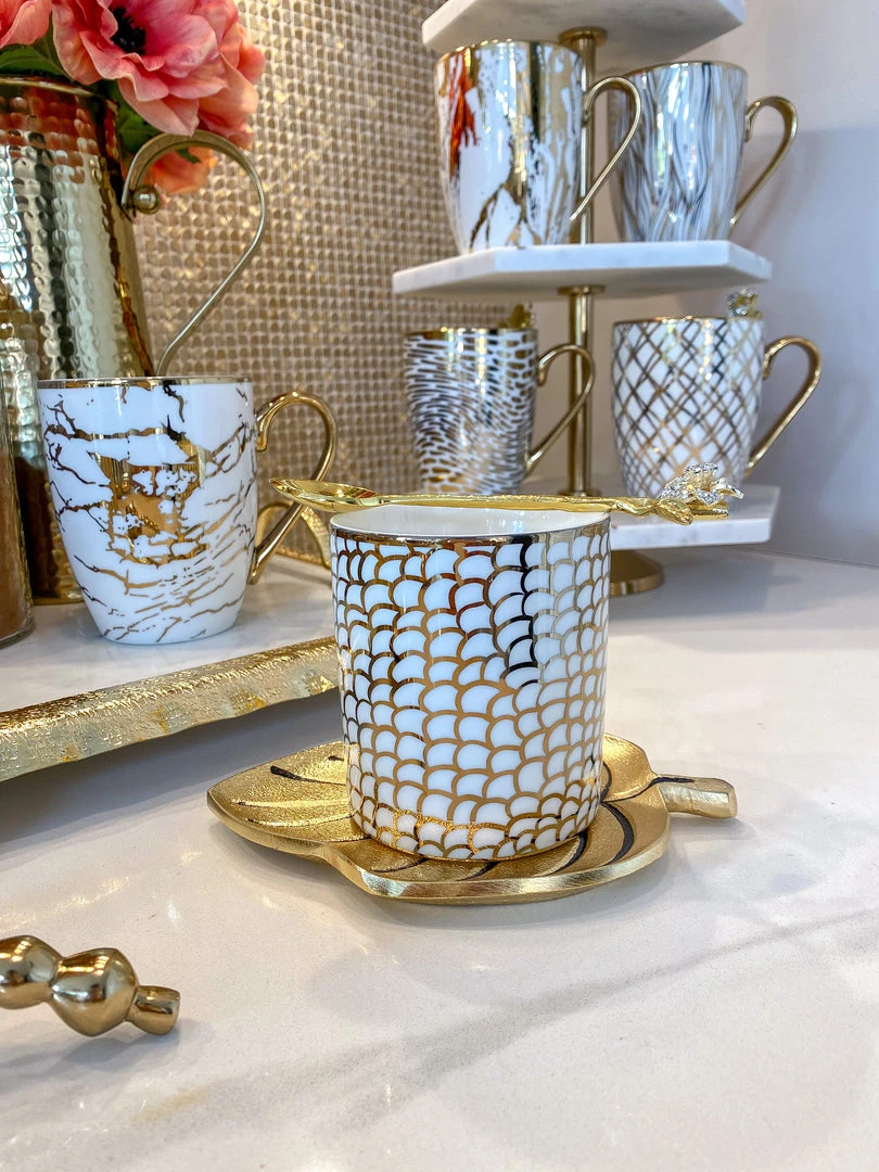 Description: These stunning gold and white mugs are perfect for your coffee station! Available in 6 designs, each sold separately.