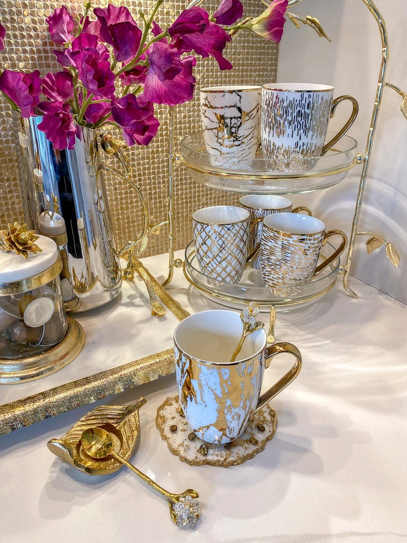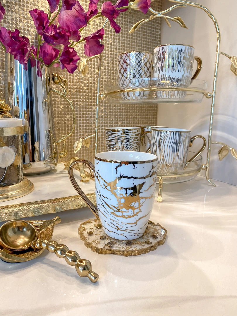 Description: Beautiful white and Gold metallic mugs with 6 different designs!