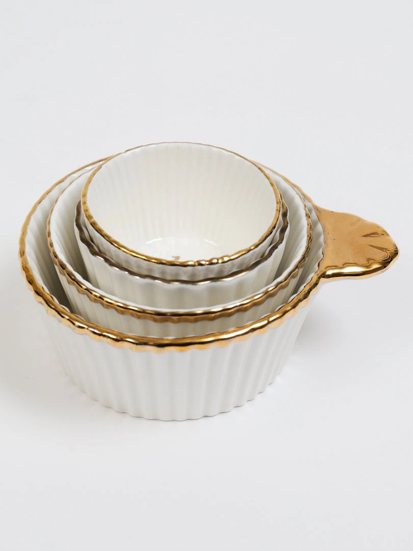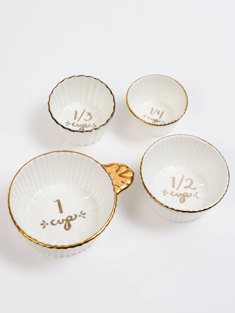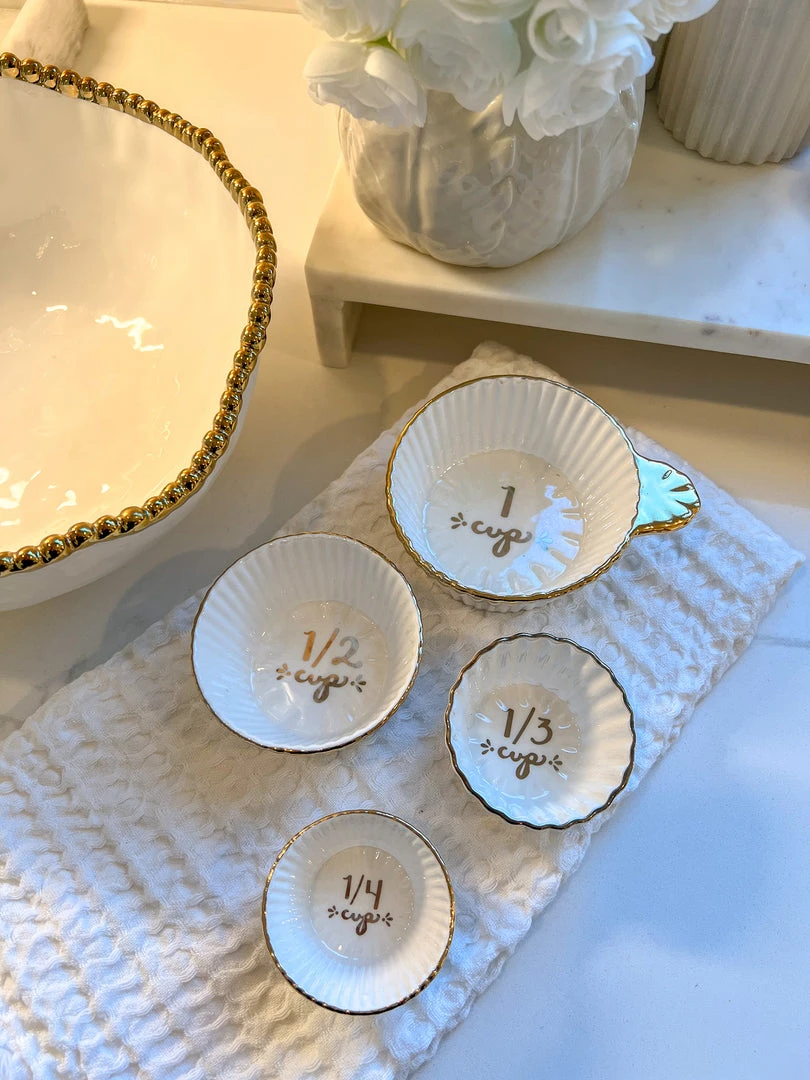 Description: These white and gold detailed measuring cups have a gorgeous gold trim and will add a touch of glam to your kitchen.