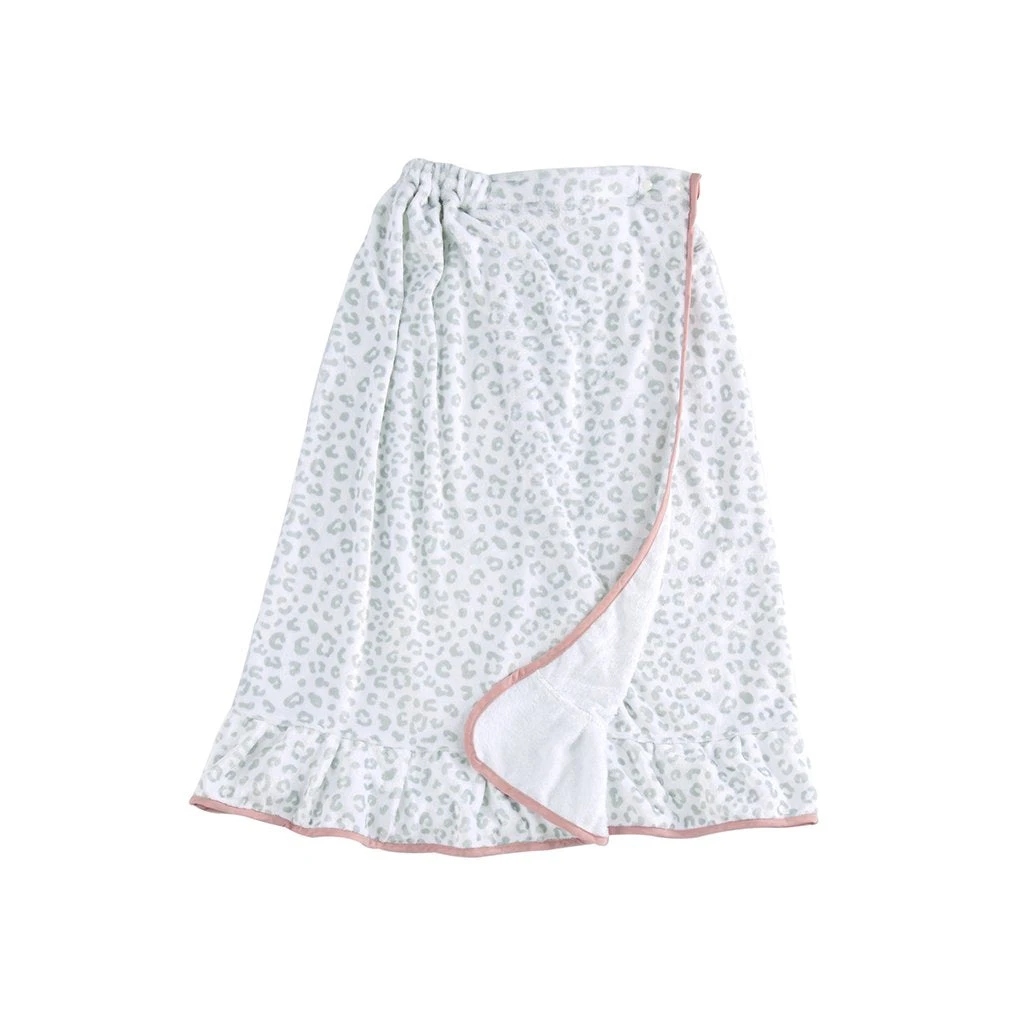 Description: This beautiful wearable towel is a great bathroom accessory! The soft grey leopard print is accented with a pink trim to great a fun look! This towel features a velcro closure to it can stay secure!