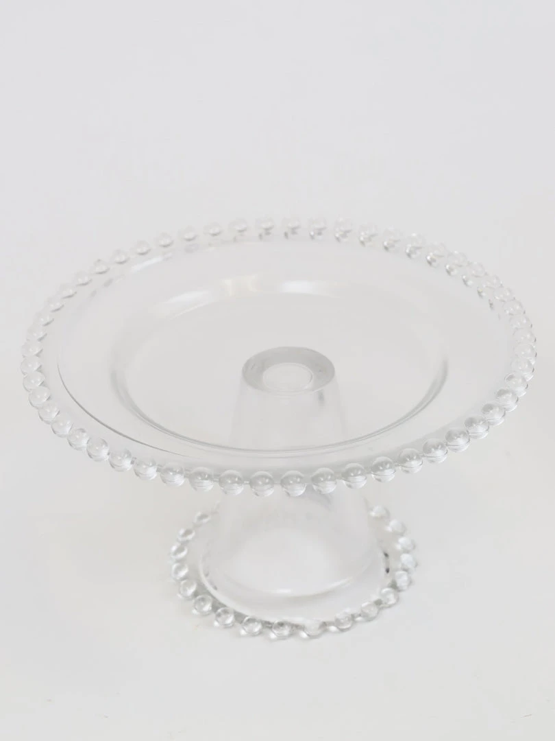 Have you been looking for a small piece to display your special items in your home? This is it! Elegant but simple glass stand with beaded trim.