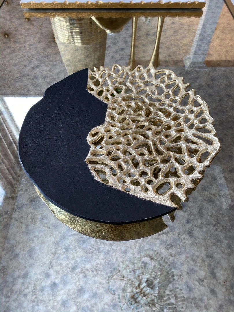 Description: This intricate black and gold plate features a very unique design that will draw eyes! Display on your coffee table or on your kitchen counter, what a cool way to mix and match colors!