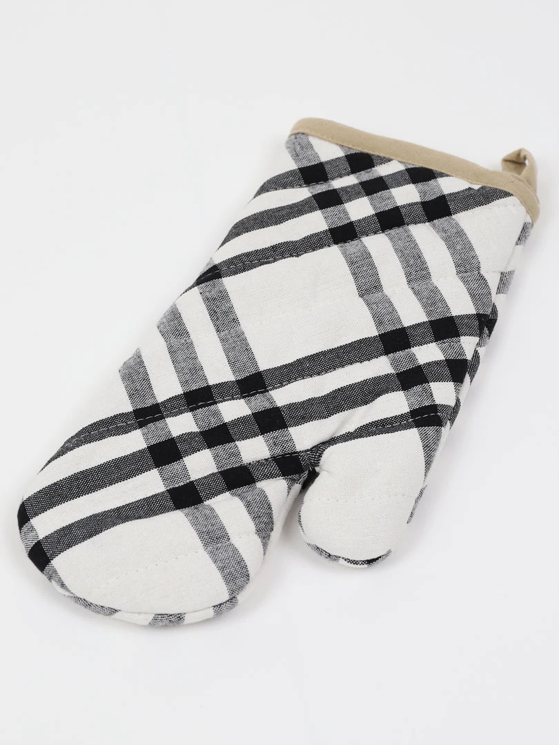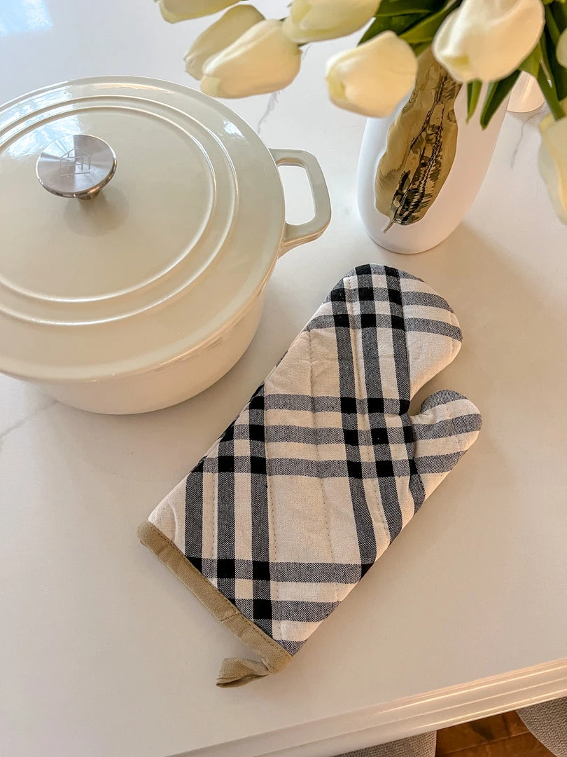 Description: We just love this super cute black, ivory and cream plaid embroidered oven mitt!
