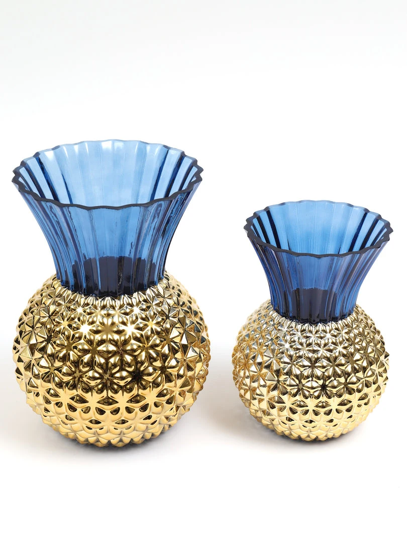 Description: This stunning textured gold vase has a gorgeous navy blue fluted top and will be perfect all year round to display your favorite florals!