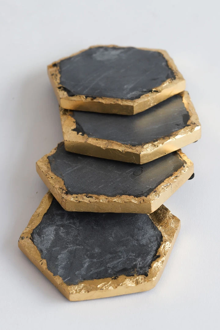 Description: These beautiful charcoal grey marble hexagon coasters are a perfect accent for your coffee table! Complete with a hammered texture edge and a metallic finish!