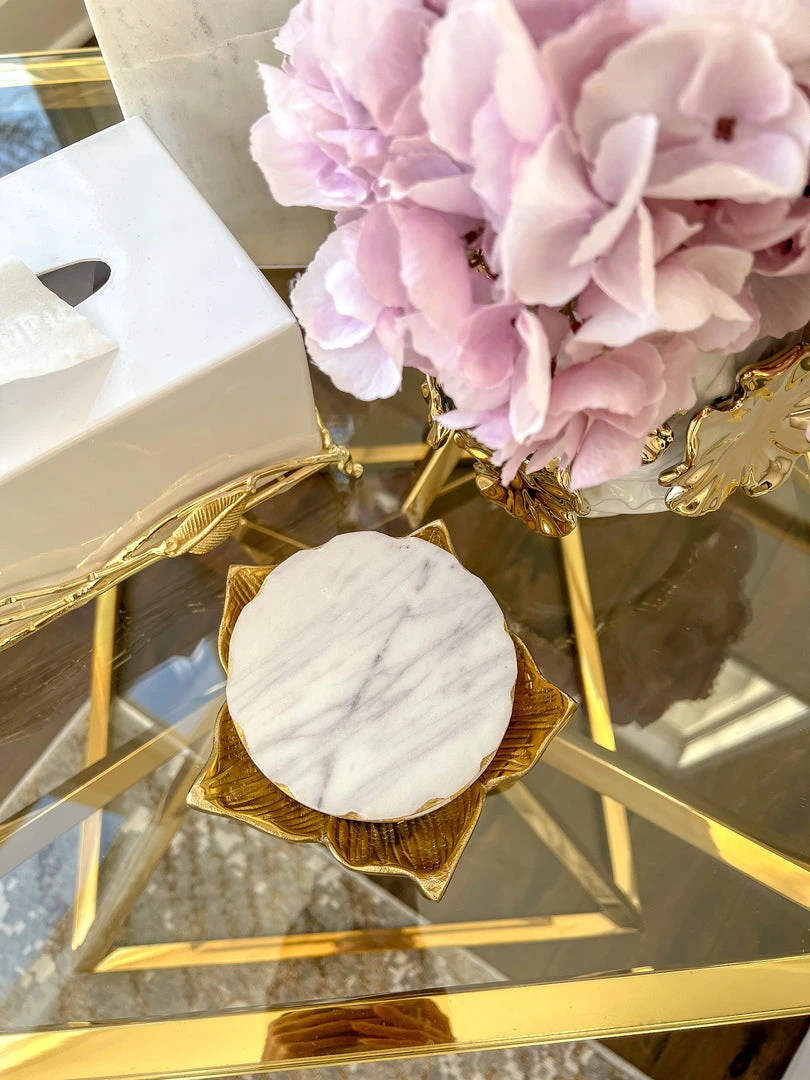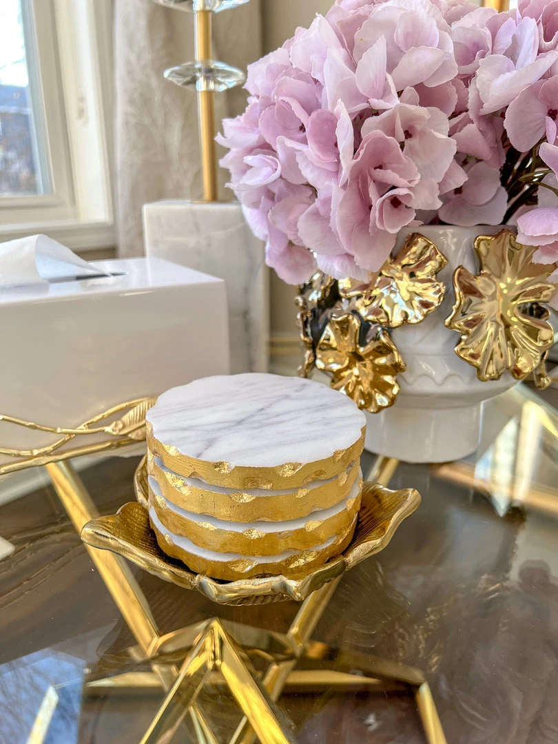Description: These round marble coasters are perfection! They feature a metallic gold foiled border. Perfect to style on a coffee or side table with a tray or on their own!
