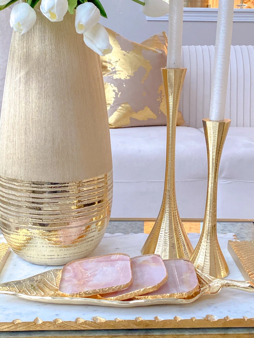 Keep your your tabletops water free with our glamorous gold trim coaster.
