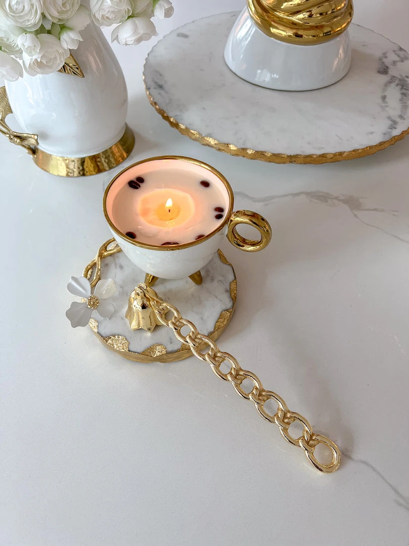 Description: This is one gorgeous white and gold mug filled with a coffee-scented soy wax. This smells so amazing! You are going to want one for every room!