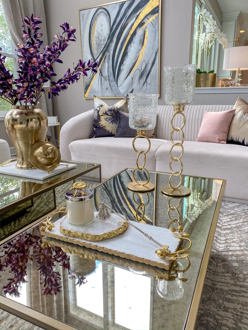 Description: These candle holders are a truly a unique piece! The design features a crackled glass pillars at the top of a metallic circle link stand. A beautiful pedestal for your favorite candles! Available in 2 sizes!