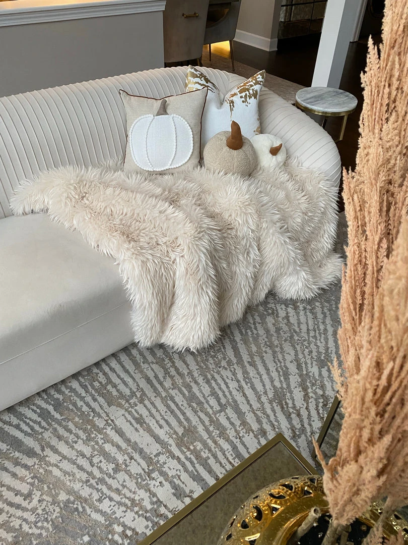 Description: This cozy pumpkin pillow is the perfect accent for fall! We love the white pom-pom details surrounding the pumpkin and brown trim accents the light-colored pillow perfect for a cozy vibe!