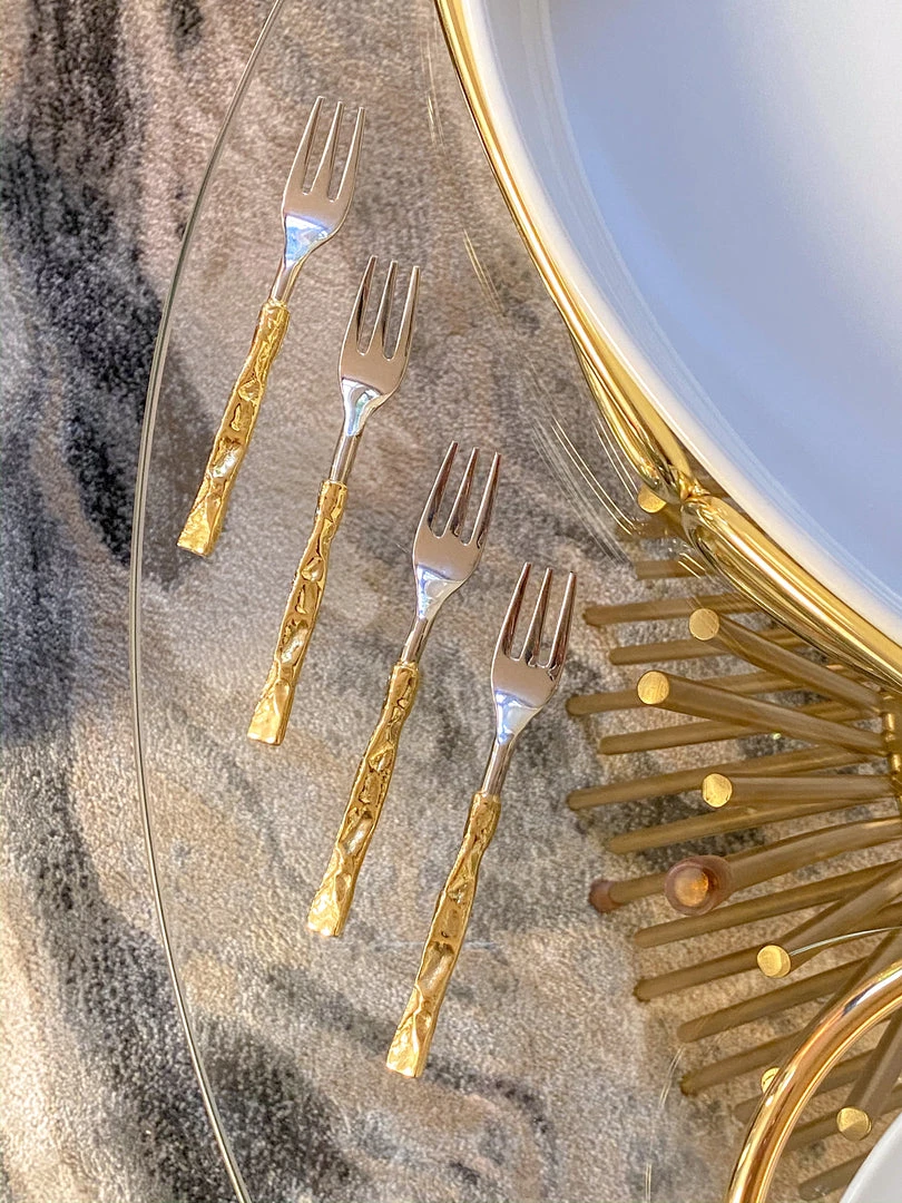 These elegant forks are perfect for snacks and match our Crumpled Gold Handle Spoons and Servers.