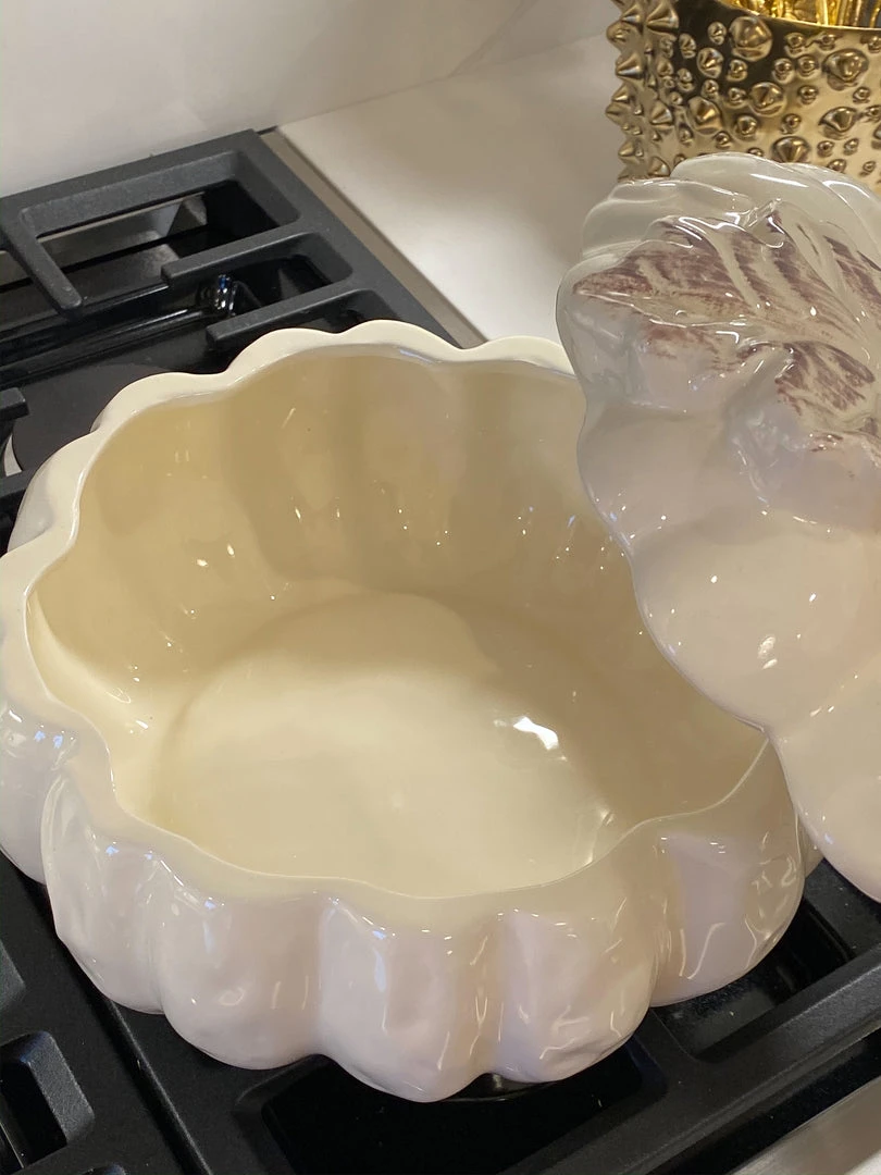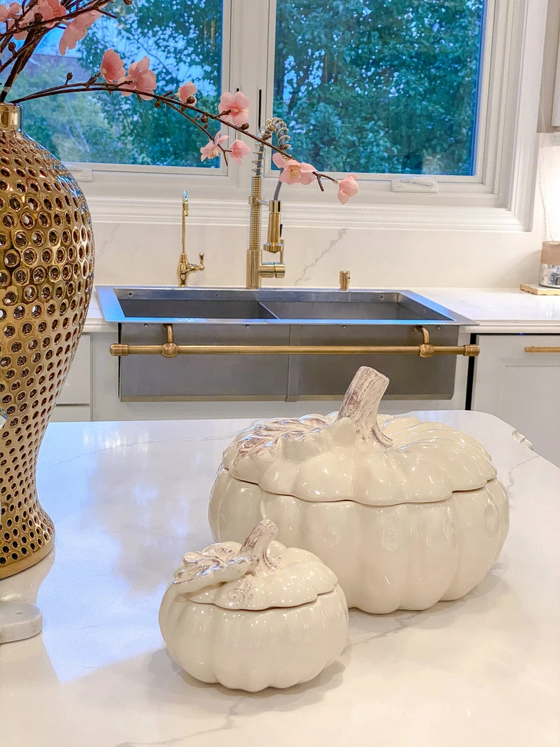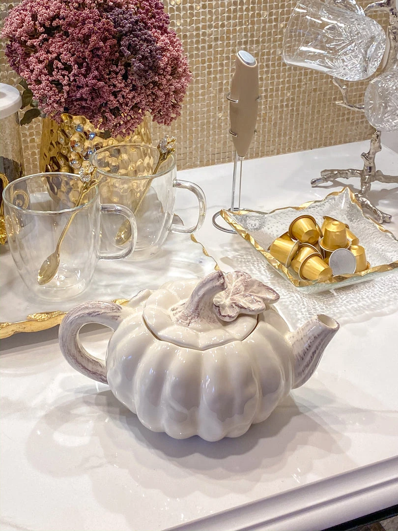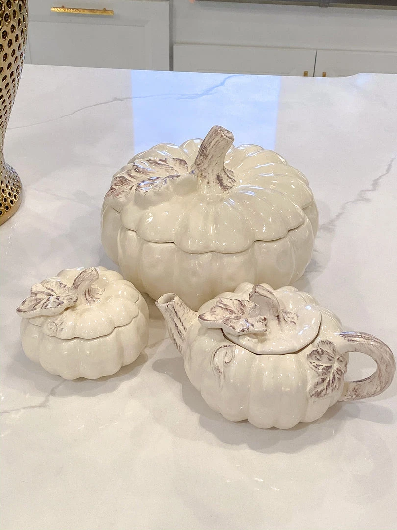 Description: This collection is a stunning way to decorate for fall! Store your snacks in style with these lidded pumpkin containers and serve your guests their favorite drinks in the pumpkin teapot. These look beautiful on any countertop.
