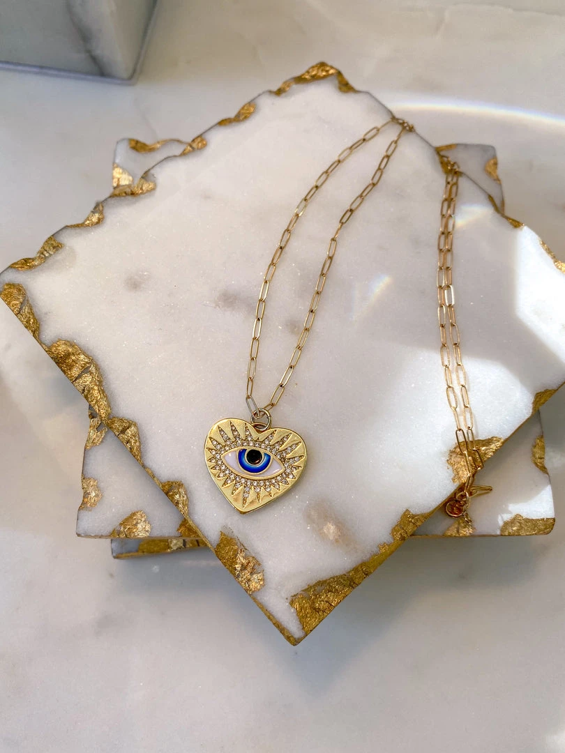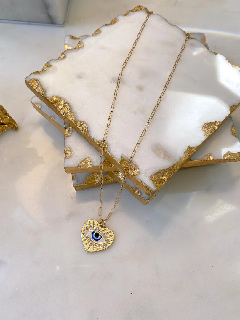 Description: This stunning Evil Eye necklace will add a beautiful detail to any outfit! The glossy gold look is a beautiful compliment to the fierce blue in the eye. Perfect for a casual or dressy outfit!