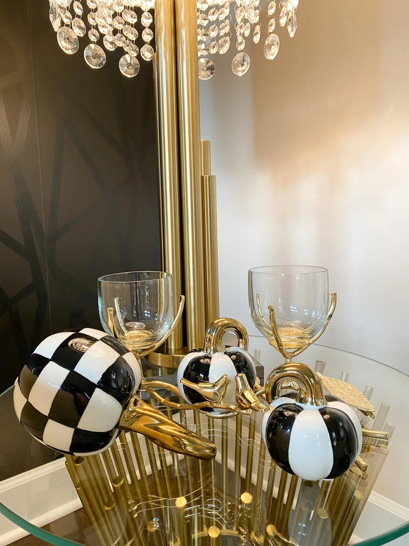 Description: This striped, black and white pumpkin with gold stem is a fun piece to add to your fall decor!