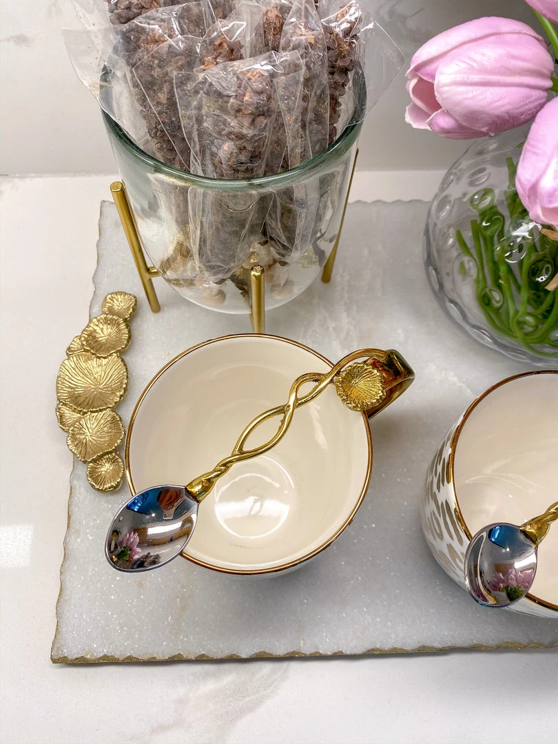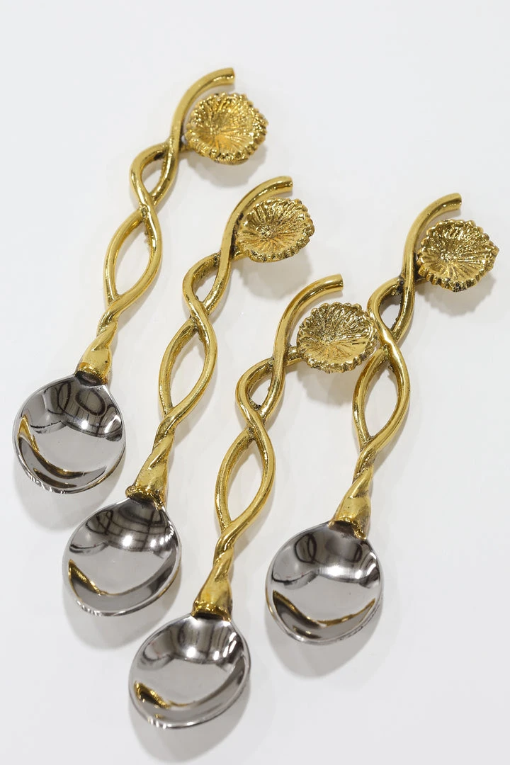 Description: These spoons are absolutely beautiful! We love the natural glam with the floral end piece, and the stylish detail of a twisted handle. Sold as a set 4.