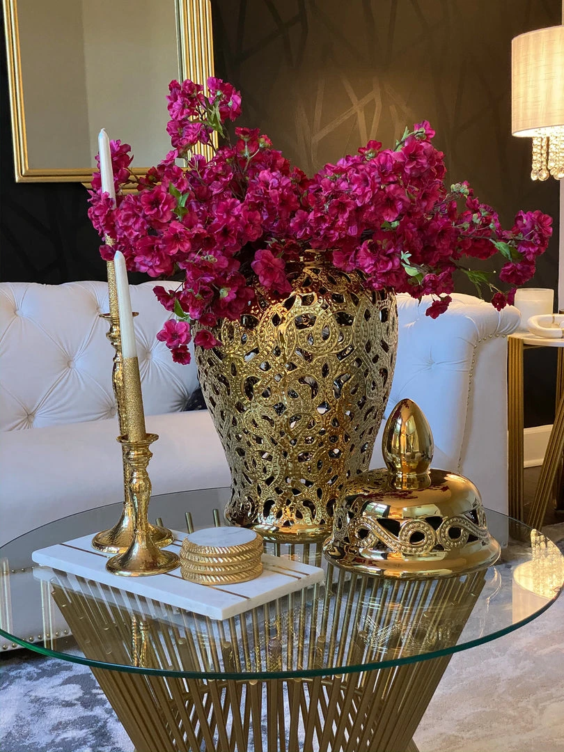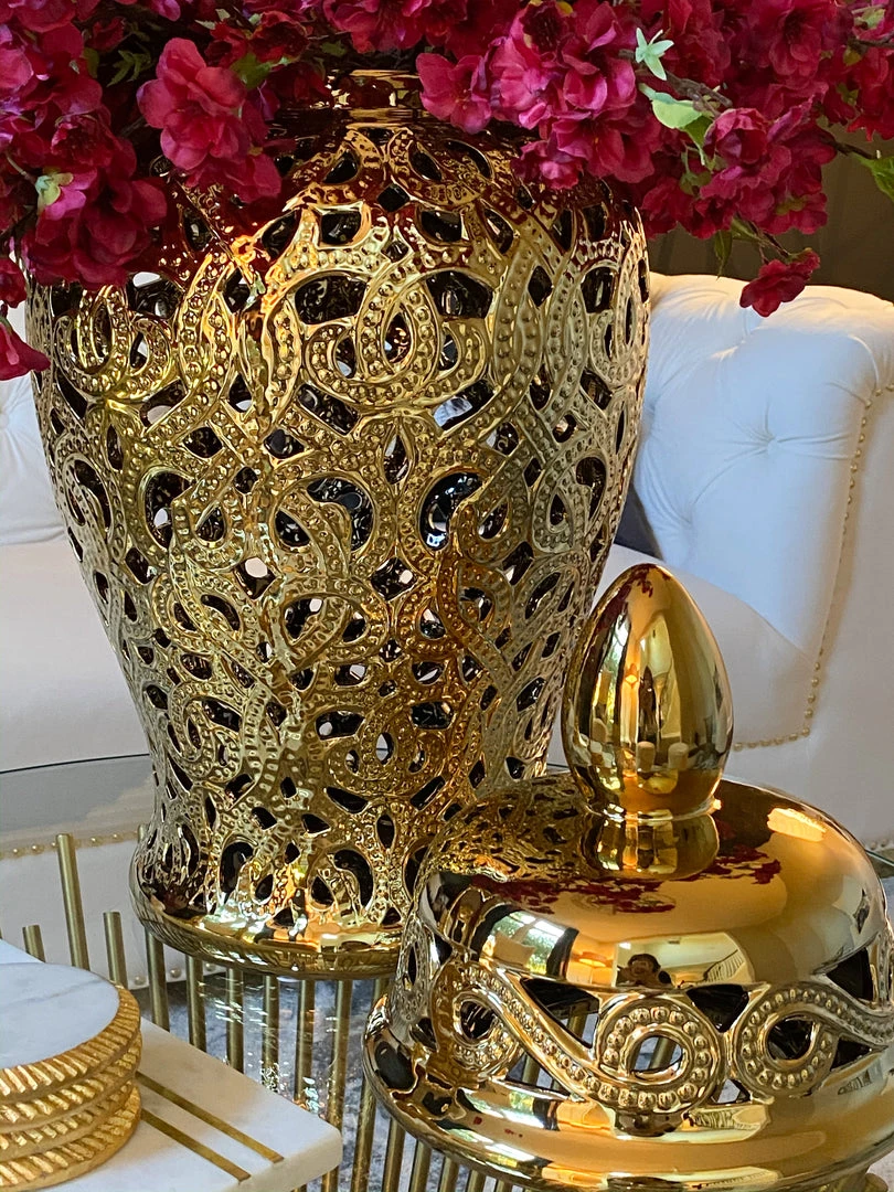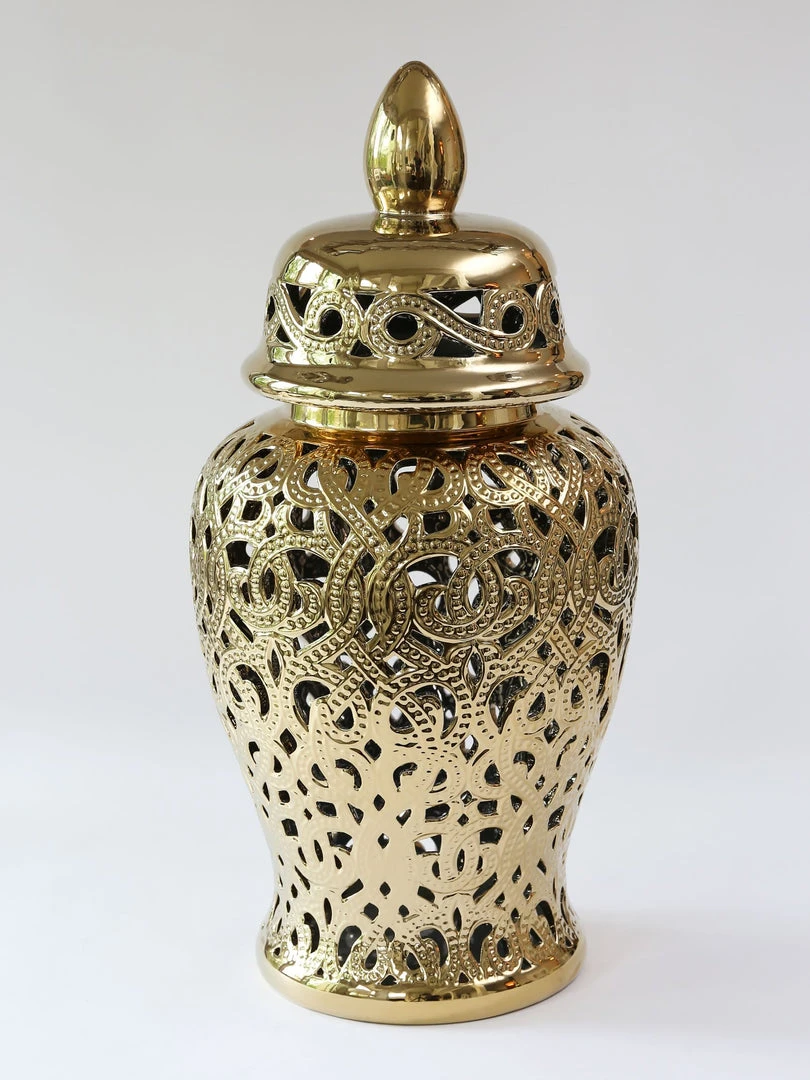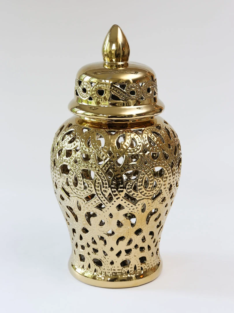 Description: This gold cut-out ceramic ginger jar is perfect for any decor!