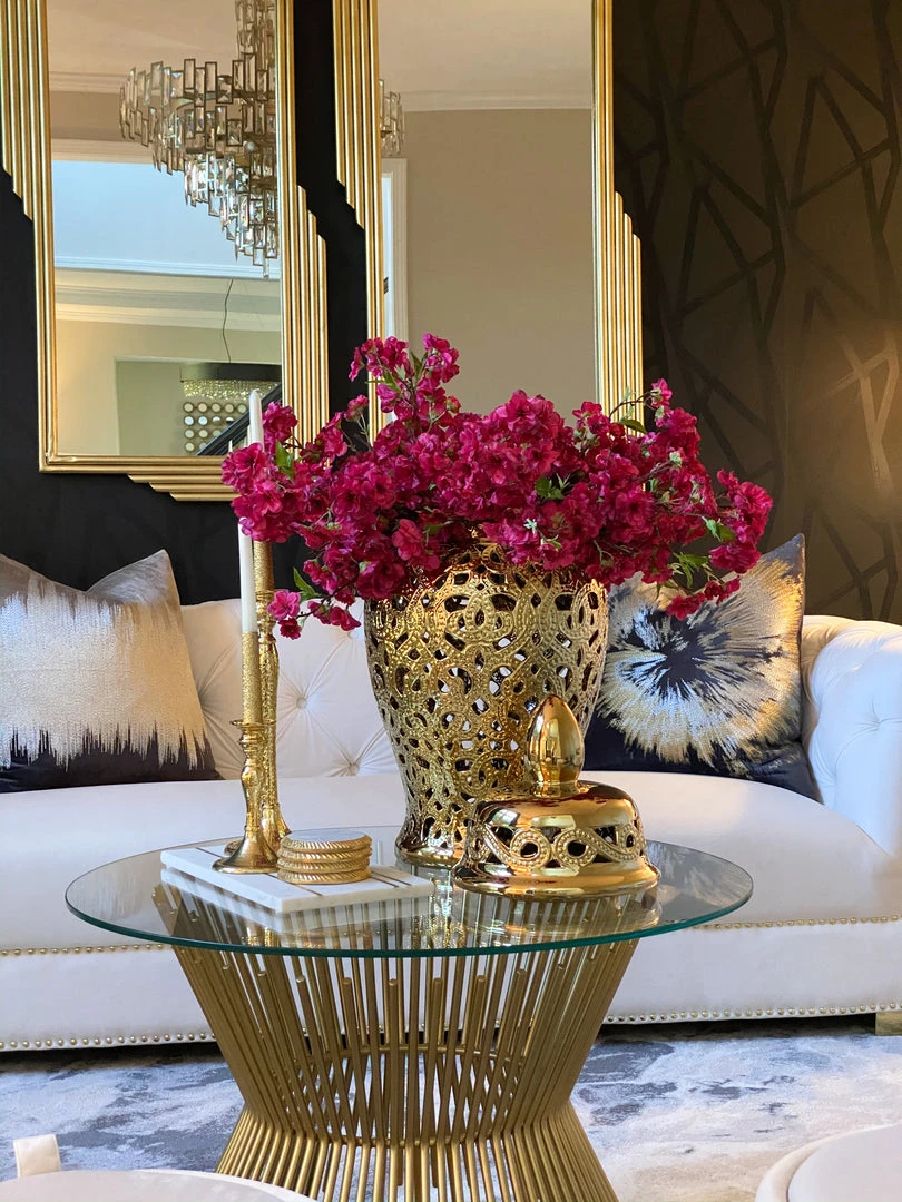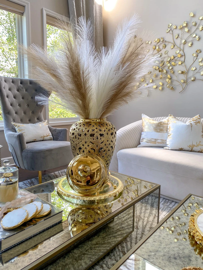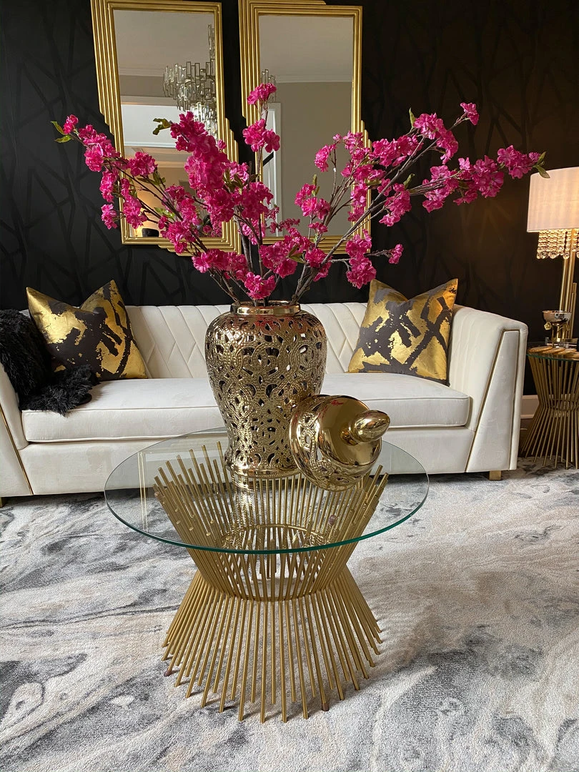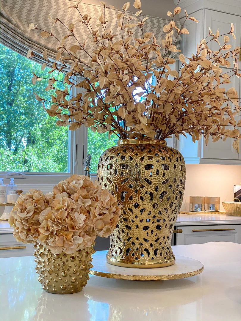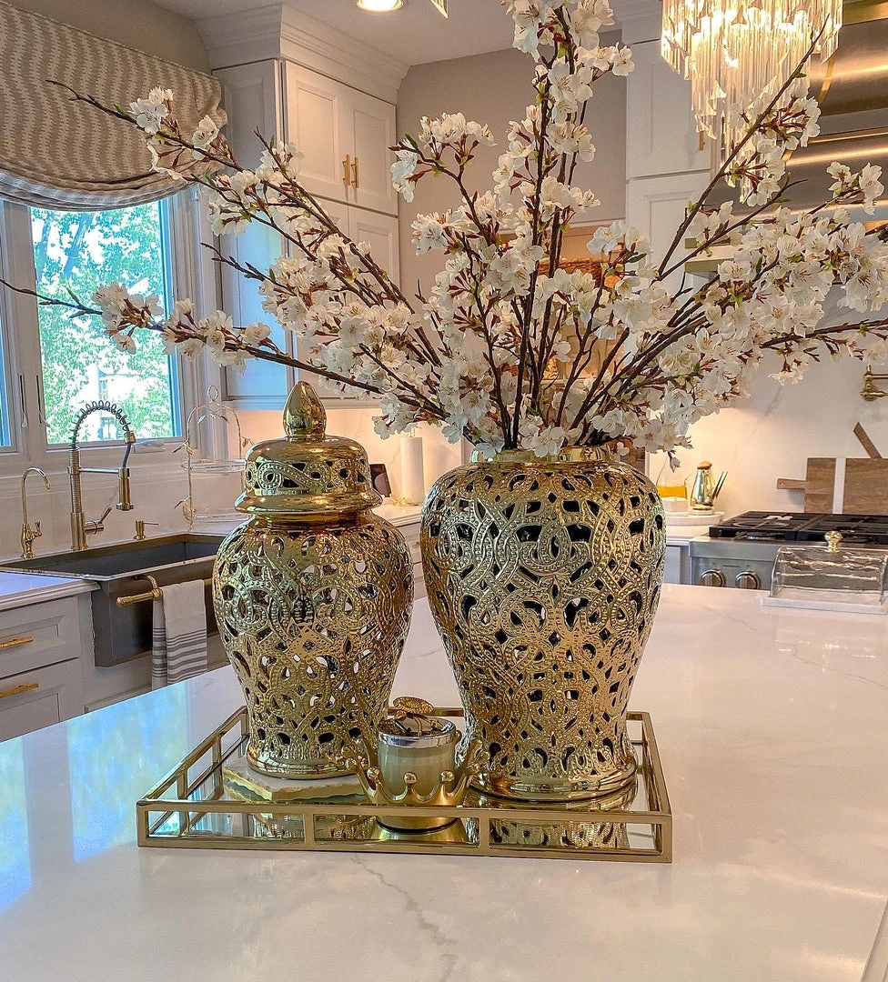 Description: This gold cut-out ceramic ginger jar is perfect for any decor!