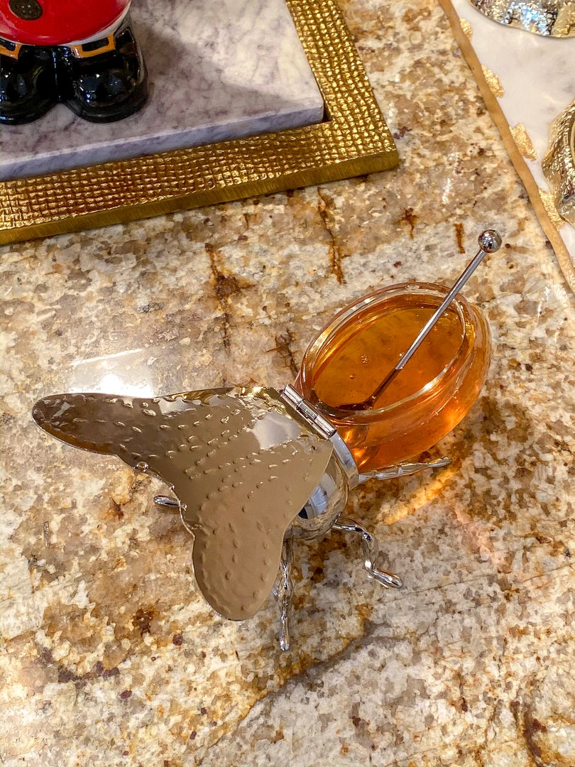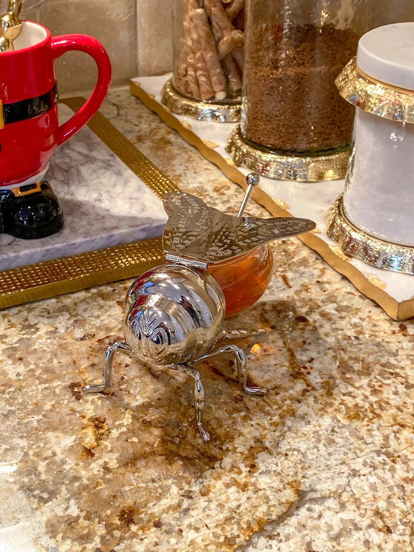 Description: Glass and metal honey holder! How cute is this?