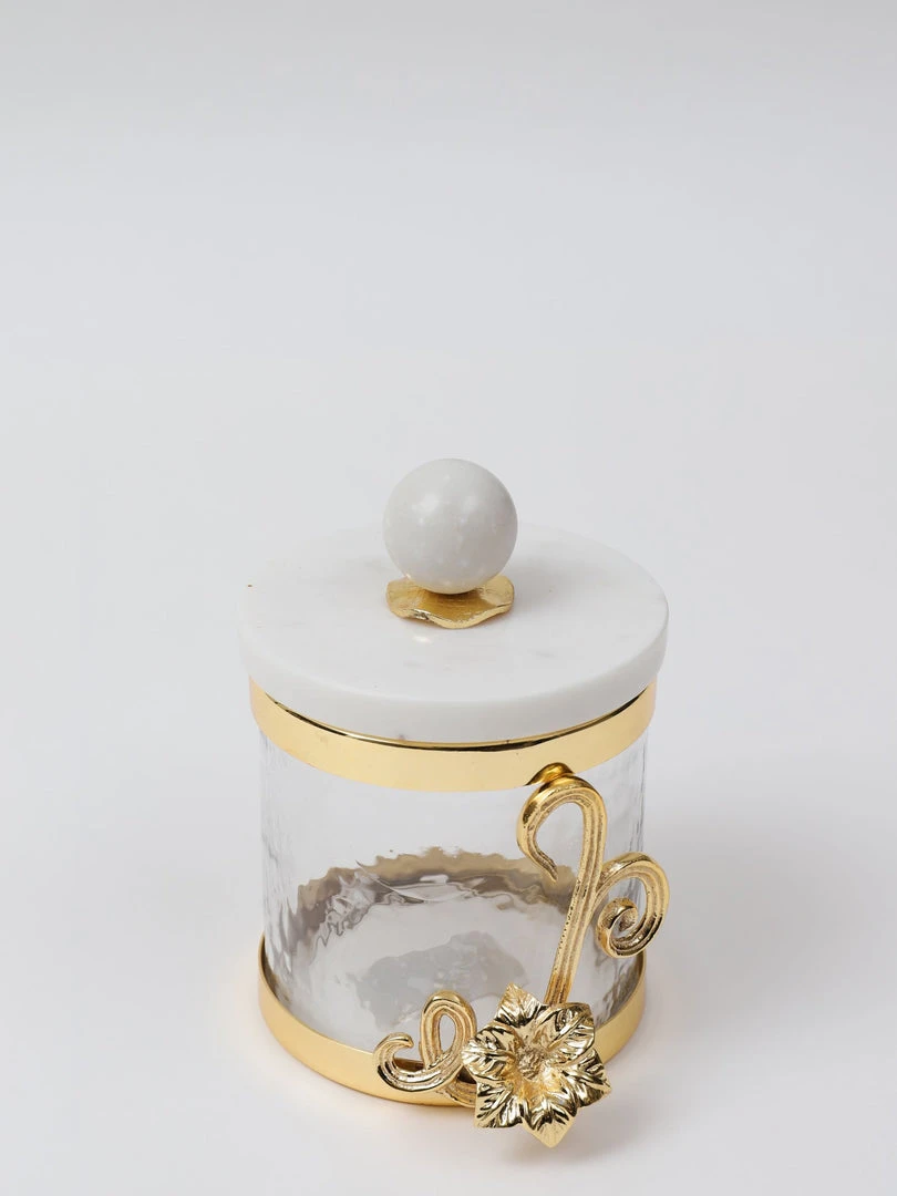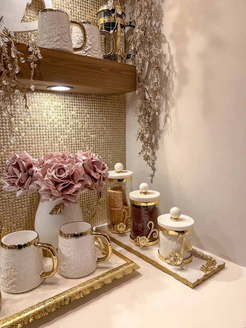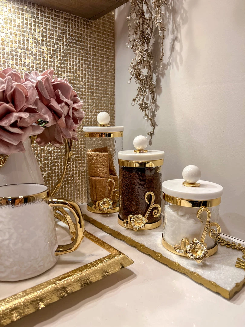 Description: These beautiful glass canisters have a golden flower design and a marble top with a gold accent. What a stunning way to showcase on your coffee station, kitchen counter, or anywhere you need storage. These would look fabulous in your bathroom as well.