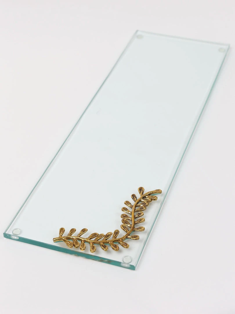 Description: Check out this elegant glass Curry Leaf tray! The rectangular shape is the perfect addition to your home decor! The touch of gold displays elegance into any space.