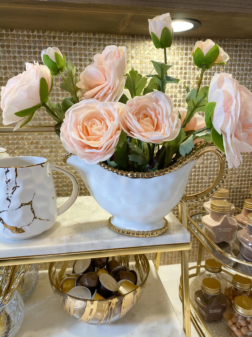 Description: This high-quality porcelain is a miracle material! It is food-safe, dishwasher safe, and oven safe up to 350 degrees! Made in Argentina, this beautiful porcelain is also tarnish-free, scratch/stain resistant, will not lose its beautiful luster, and is perfect for everyday life! Baking and serving never looked so good! This piece is an IMHD favorite! We love this detailed gravy boat. Use this to pour gravy, sauce, or anything else you can think of! We love the gold beading on the edges and the texture on the white surface.