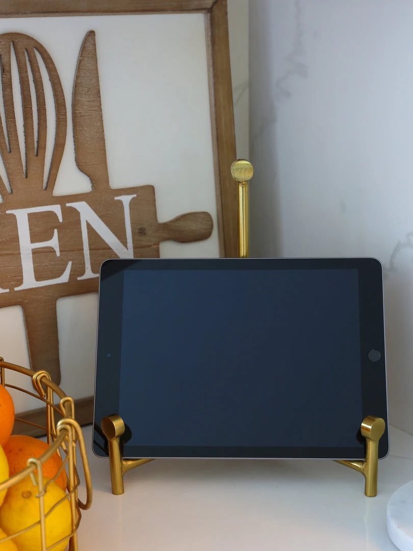 Description: This golden easel is a great way to prop up your items in style! Functional for books, electronic tablets, papers, and more!