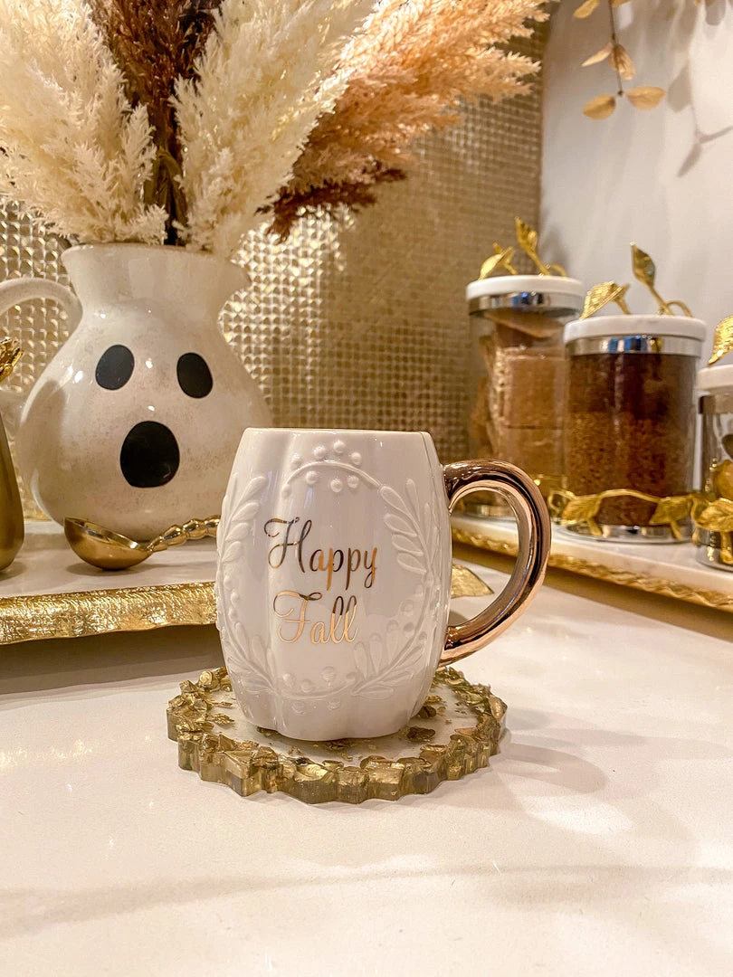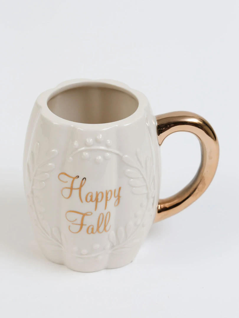 Description: This adorably elegant mug is perfect for fall! We love the glossy gold script and handle, combined with the stunning raised details and pumpkin-shaped design. Happy fall everyone!
