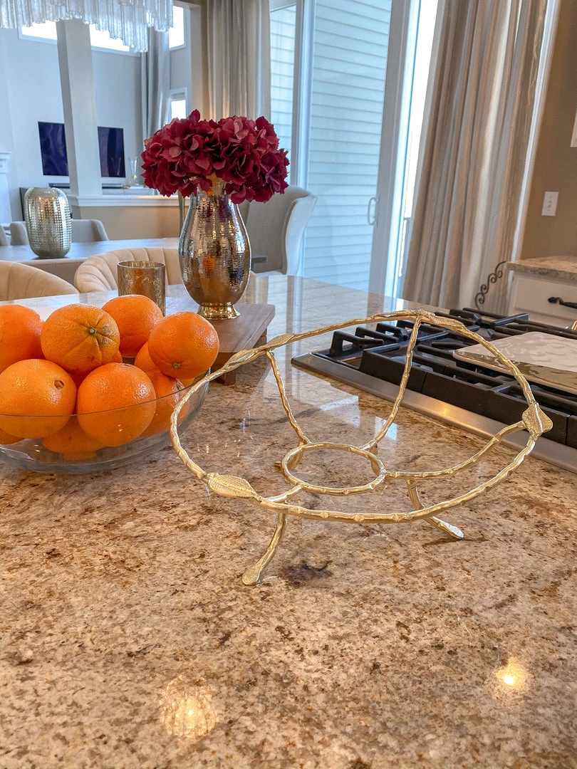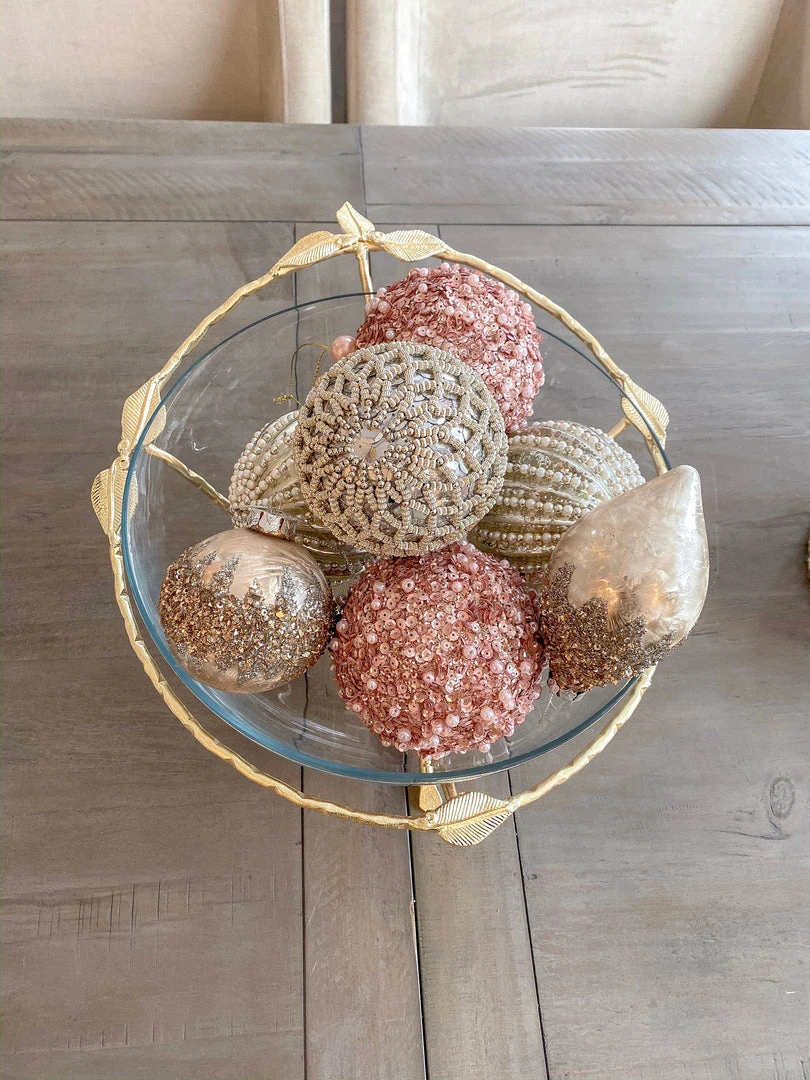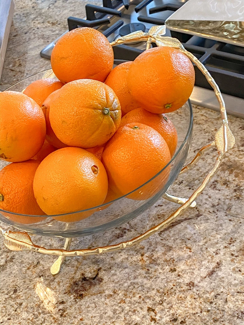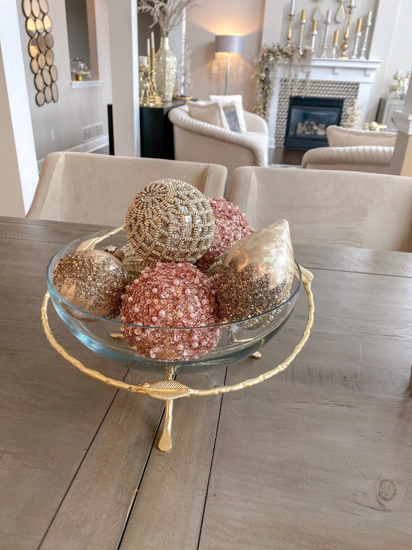 Description: Glass bowl on a beautiful leaf metal stand for that elegant feel all year round.