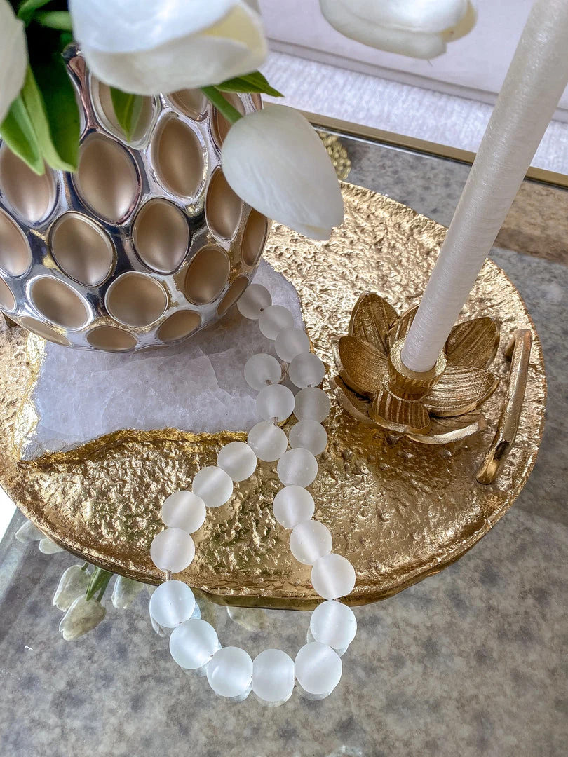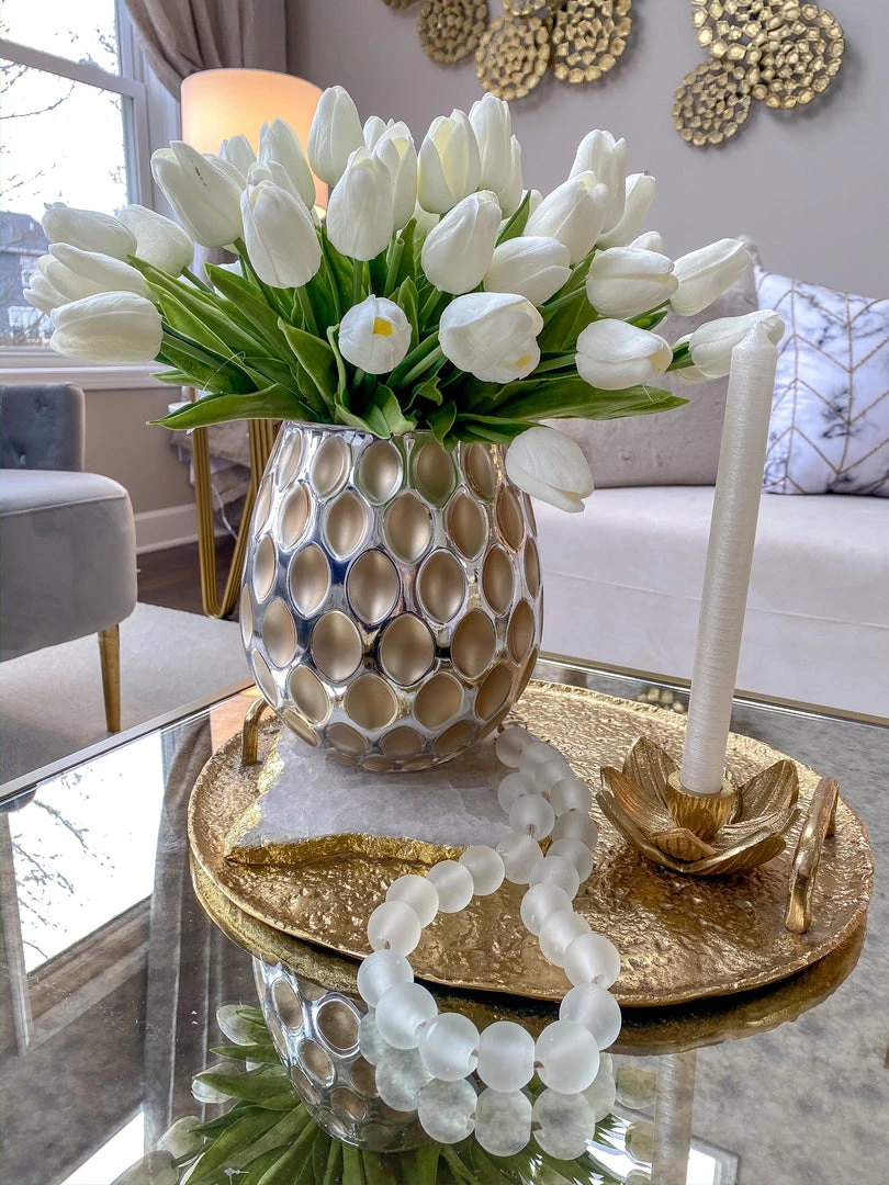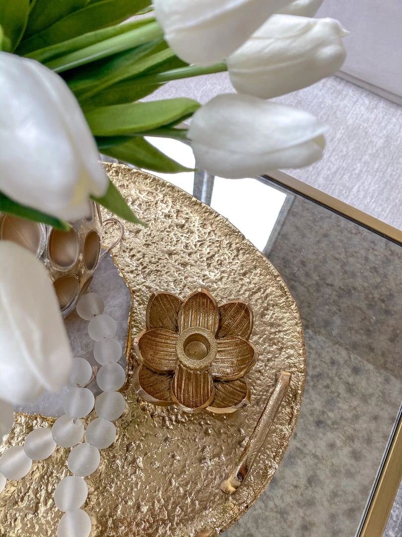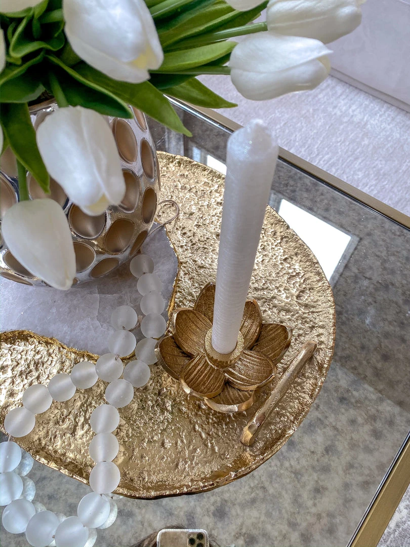 Description: This metal lotus candle holder is such a cute addition to any tray in any setting! Add a tapered candlestick and you have an adorable piece! Comes in gold and silver.