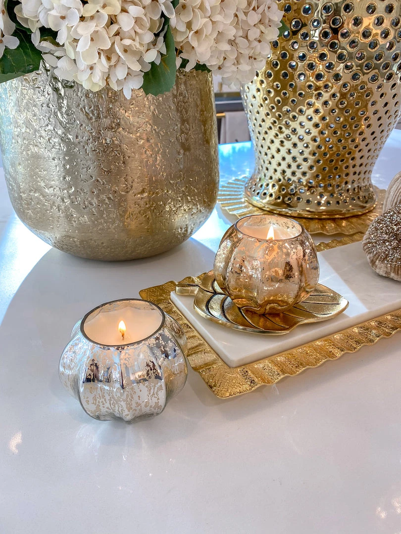 Description: This mercury glass candle offers a perfect blend of glam and traditional styles! Featuring the warm scent of rustic pumpkin, this is perfect to create the fall feeling in your home!