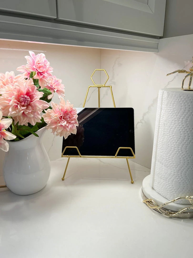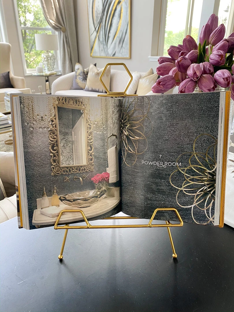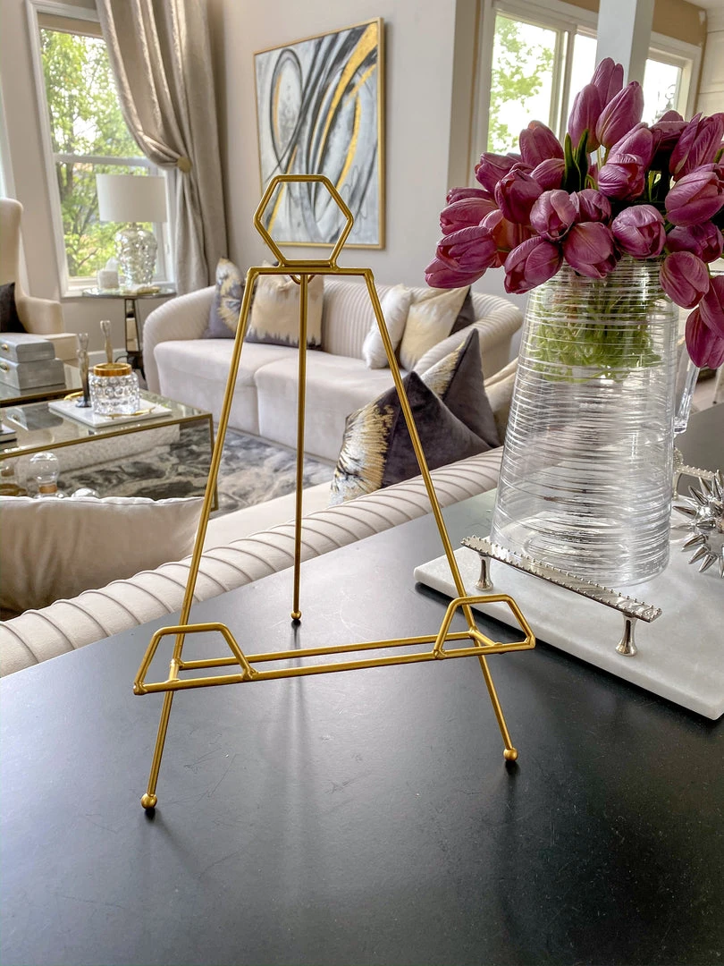 Description: This gold metal folding easel is a unique way to display pictures or other decor pieces.