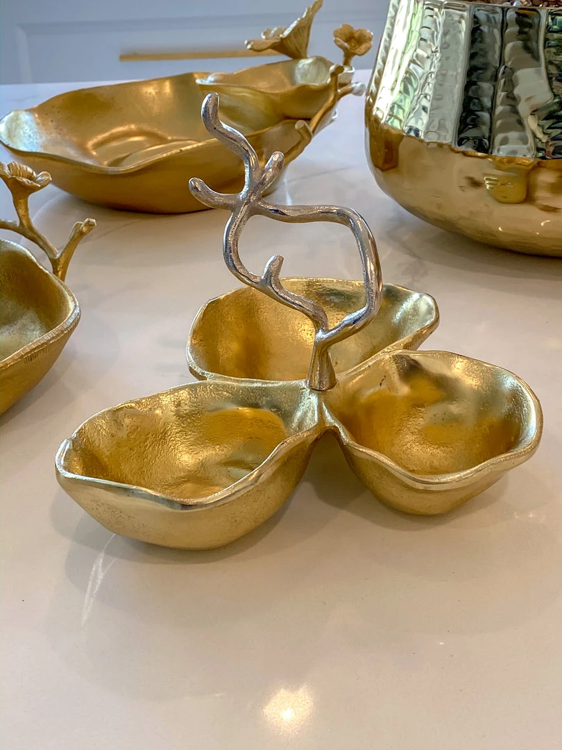 Description:Â This gold metal triple snack bowl is a stunning piece for entertaining or for everyday use and features a silver floral handle that threads into the center.