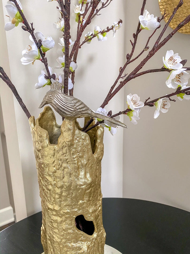 Description: This gold metal “tree” vase features a bark-like gold finish and a small silver bird. It is a great way to introduce some nature into your decor!