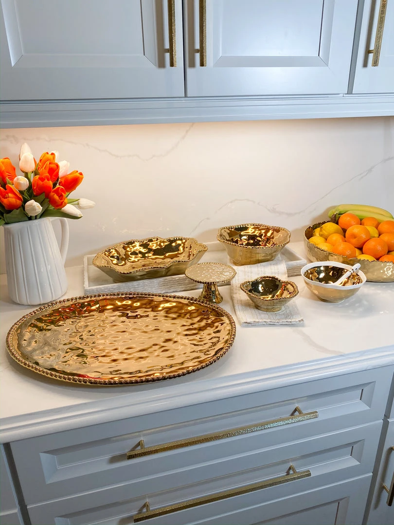 Description: This high quality porcelain is a miracle material! It is food safe, dishwasher safe, and oven safe up to 350 degrees! Made in Argentina, this beautiful porcelain is also tarnish free, scratch/stain resistant, will not lose its beautiful luster, and is perfect for everyday life! Baking and serving never looked so good! This oval beaded platter has a beautiful hammered texture and can be used for serving or for displaying your decor! Ties back perfectly to our other gold beaded porcelain items.