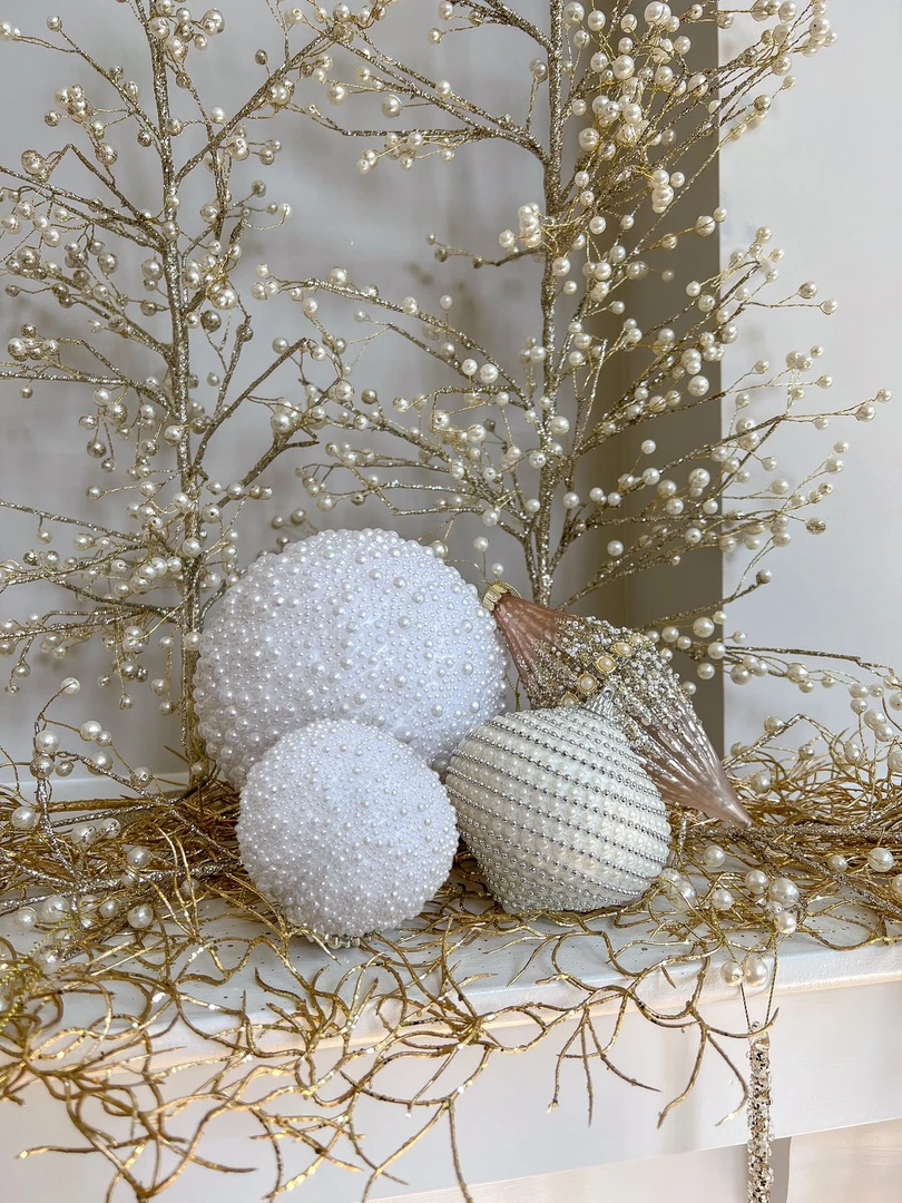 Description: This beautiful beaded white and pearl ornament is the perfect add on to your holiday tree! Available in two sizes. Priced for one ornament.
