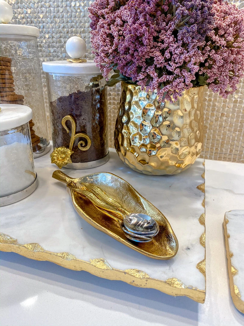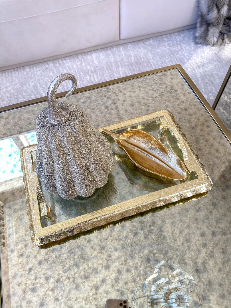 Description: This gorgeous gold tray is perfect for displaying our coasters, candles or snacks!