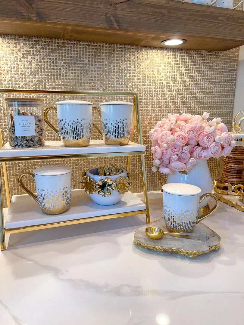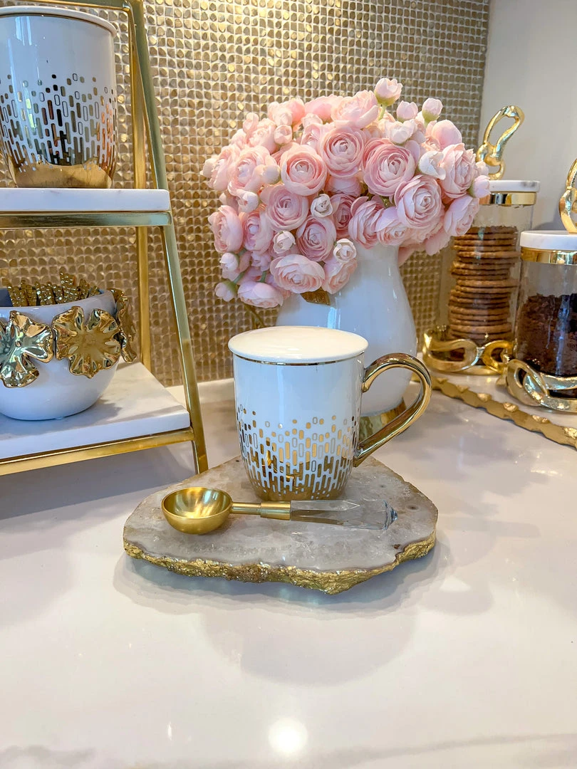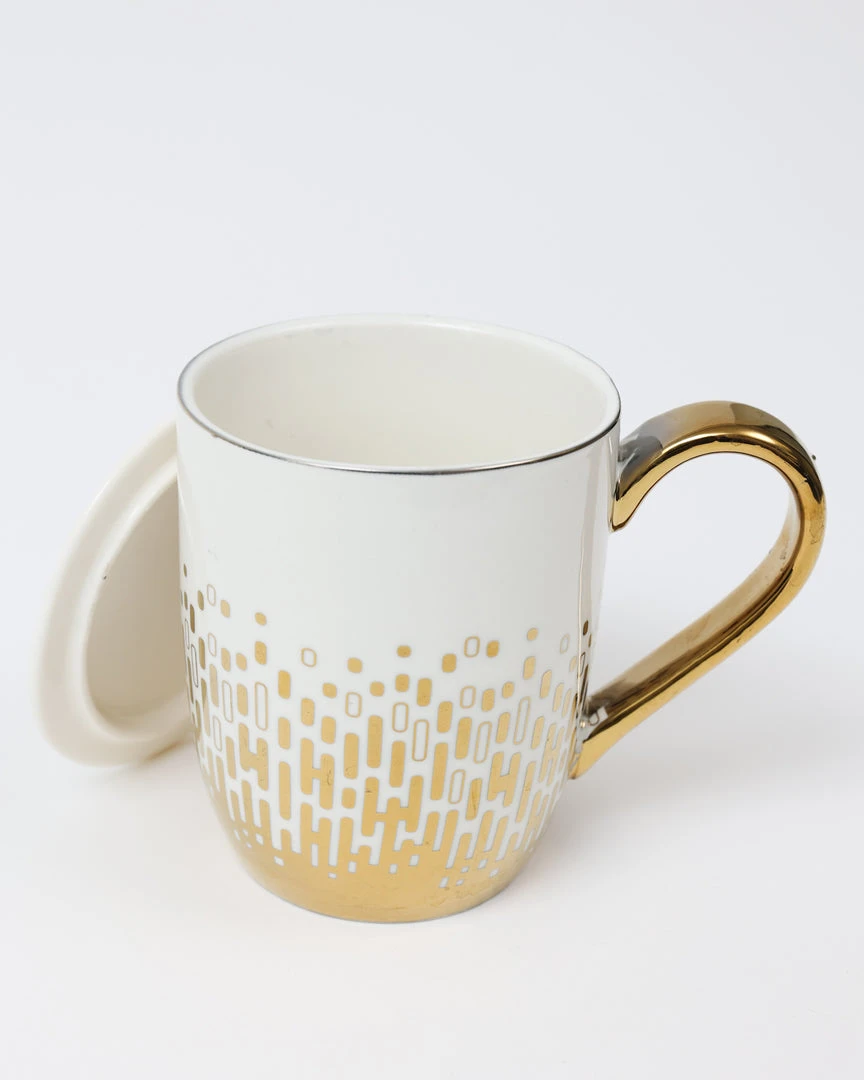 Description: This is one gorgeous gold and white mug with a ceramic lid to keep your coffee or tea warm as can be!