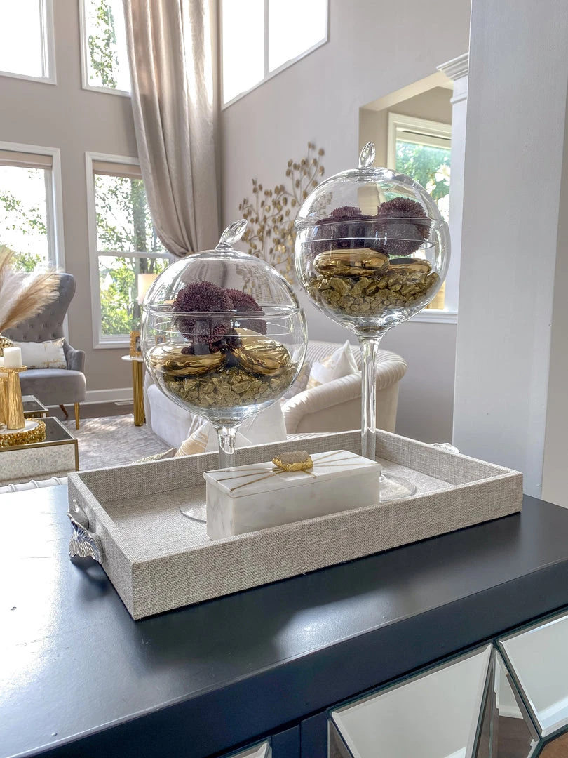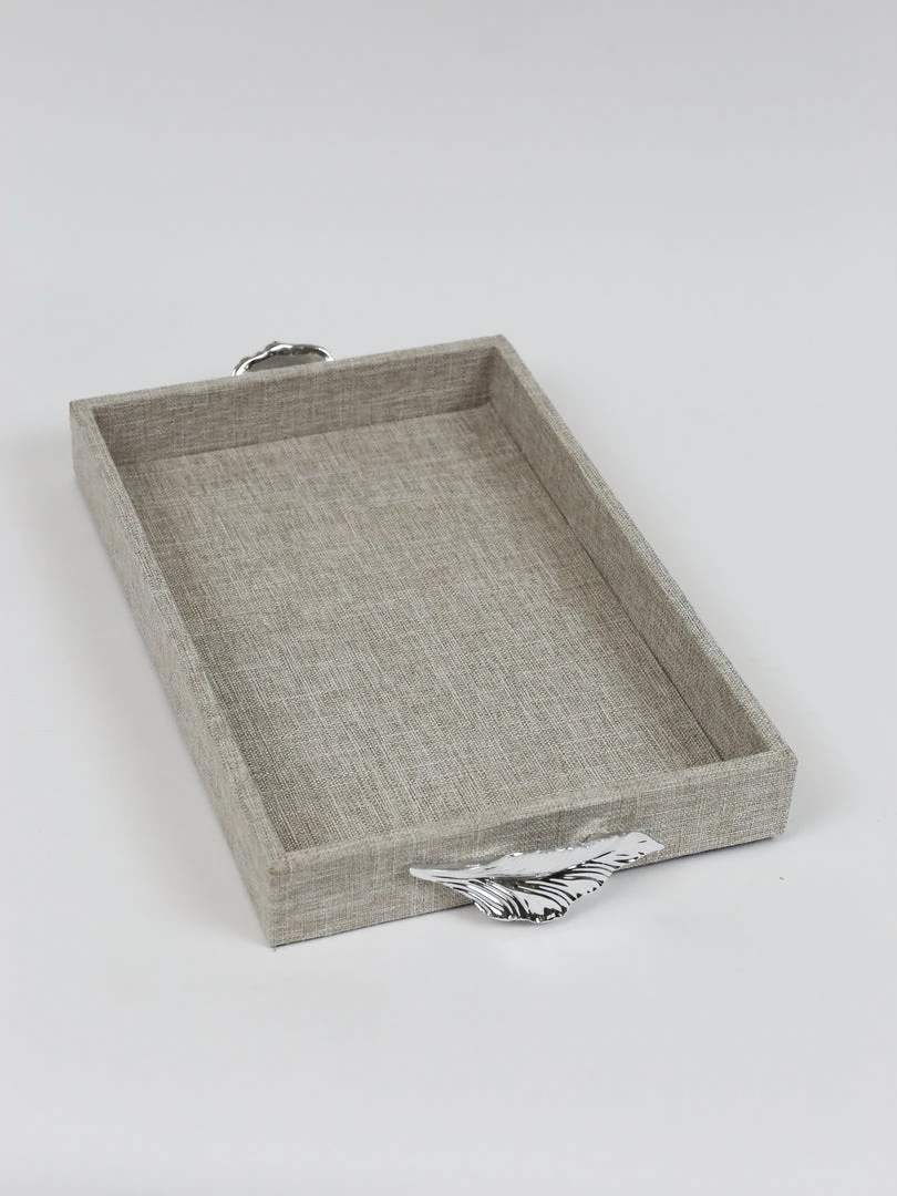 Description: This stunning fabric colored tray features a shiny silver handle and comes in two different sizes! We love to mix and match them with our favorite layering pieces.