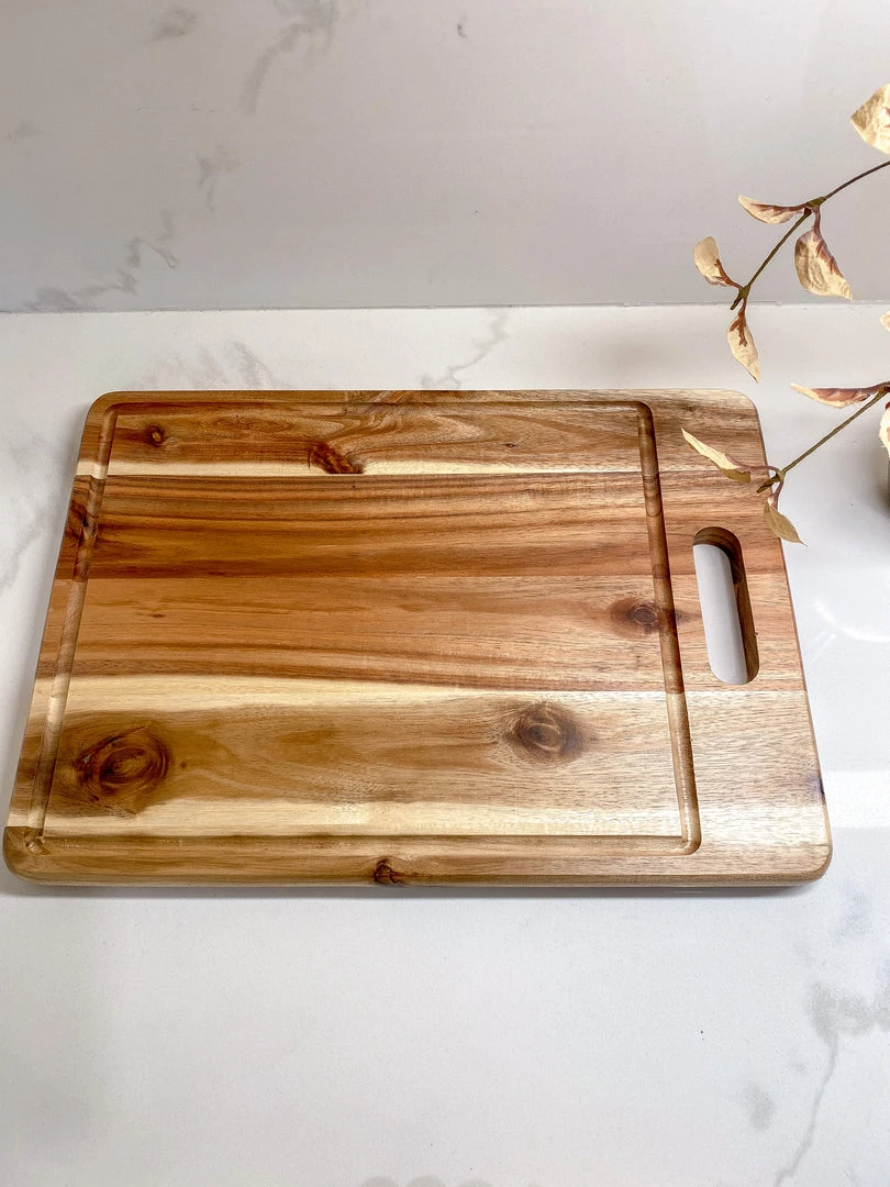 Description: This simple cutting board is sophisticated and functional! The slotted groove helps catch any liquid before they reach your counter!