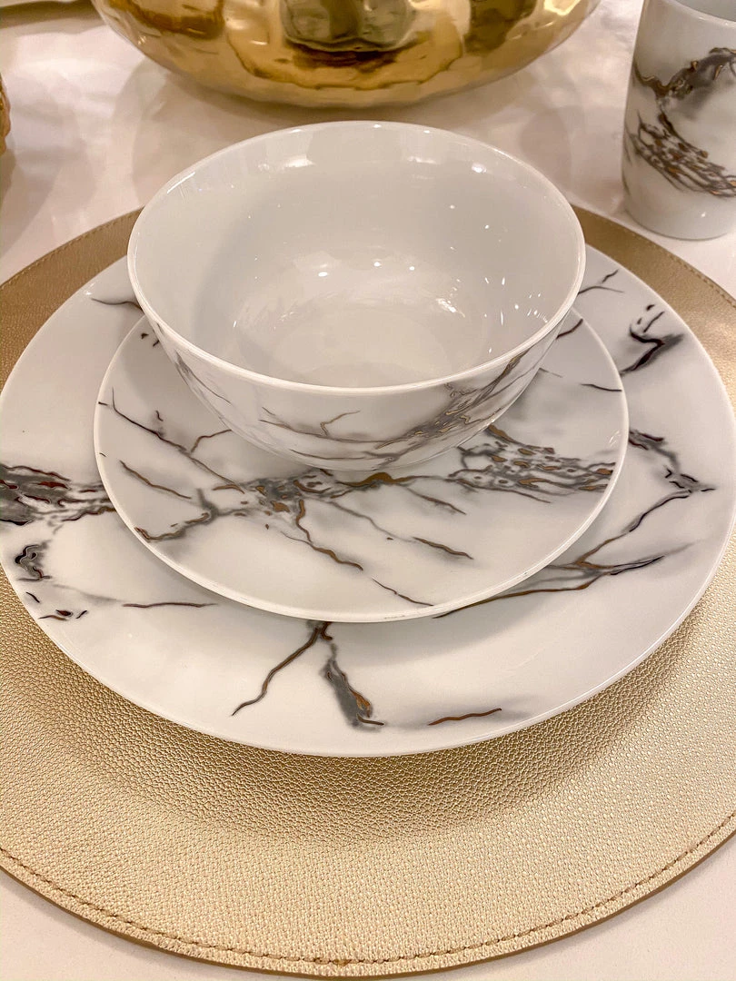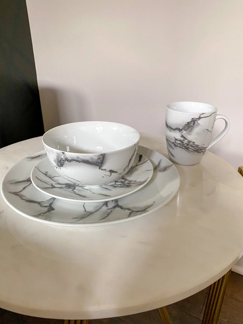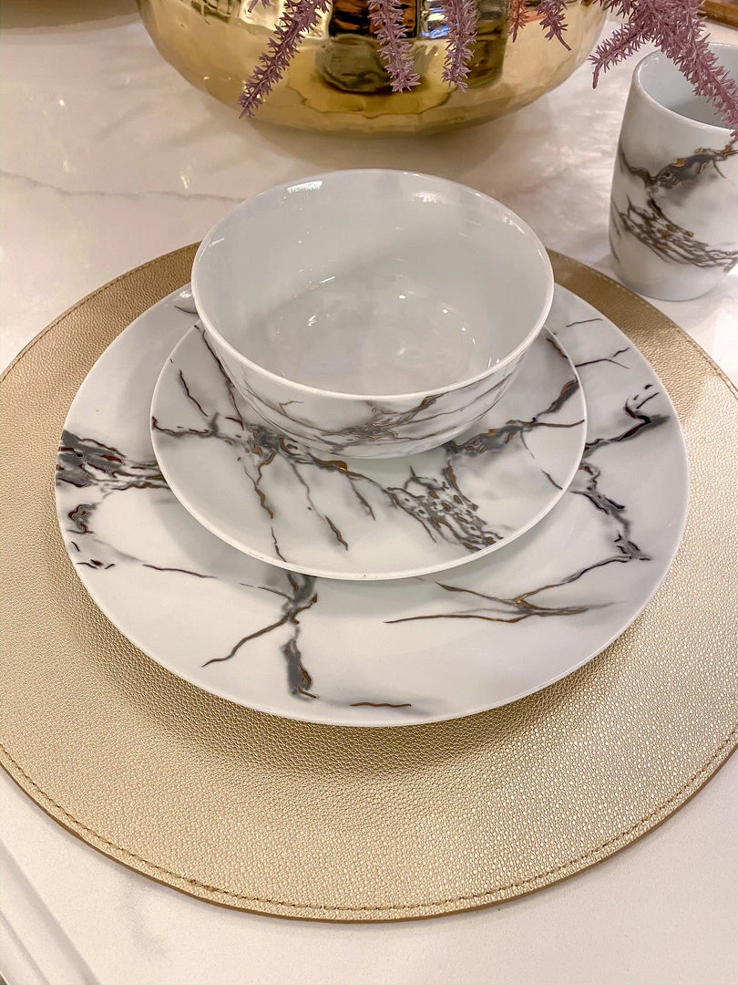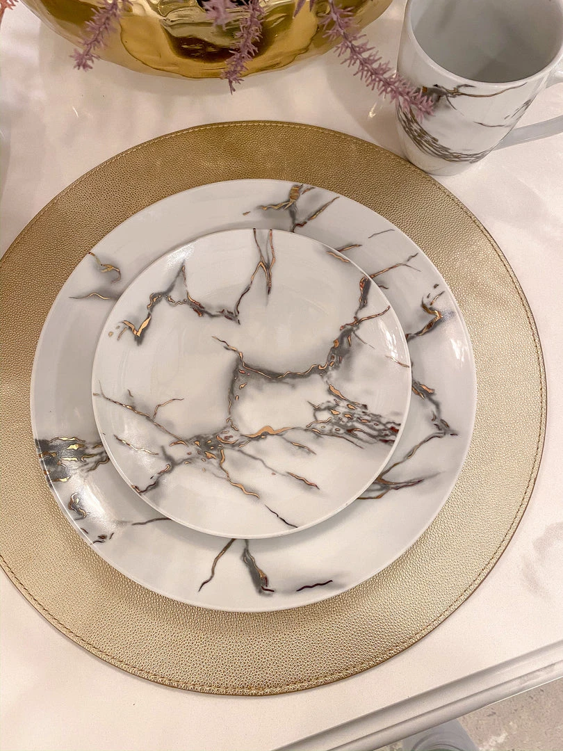 This ceramic marble dining set will take each meal to the next level with beauty and elegance. Featuring a faux metallic marble veining!