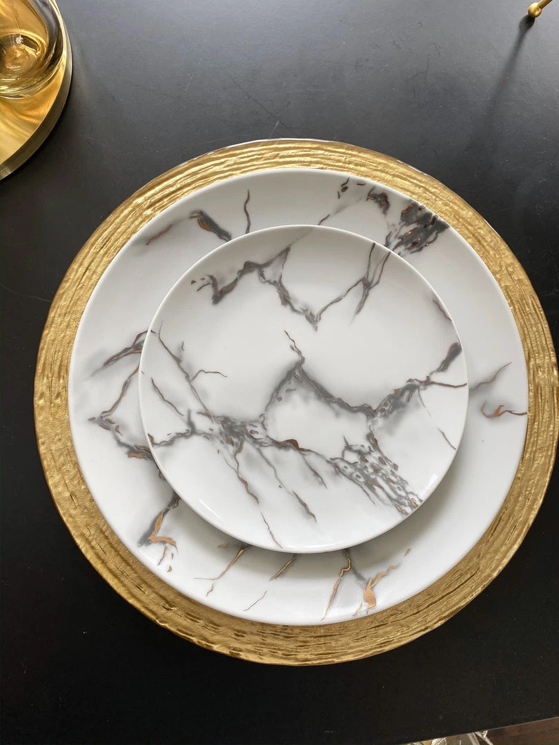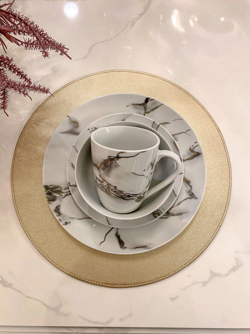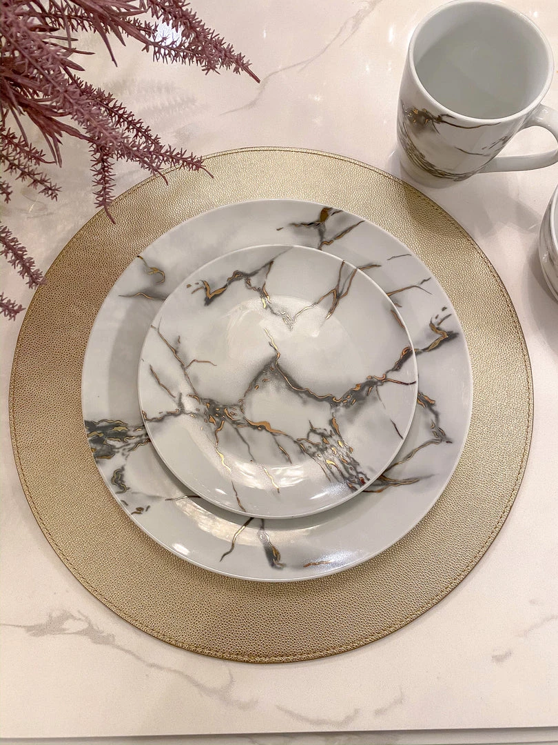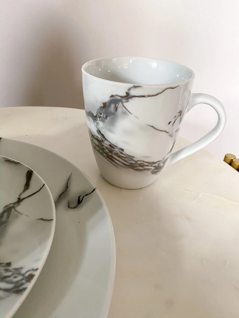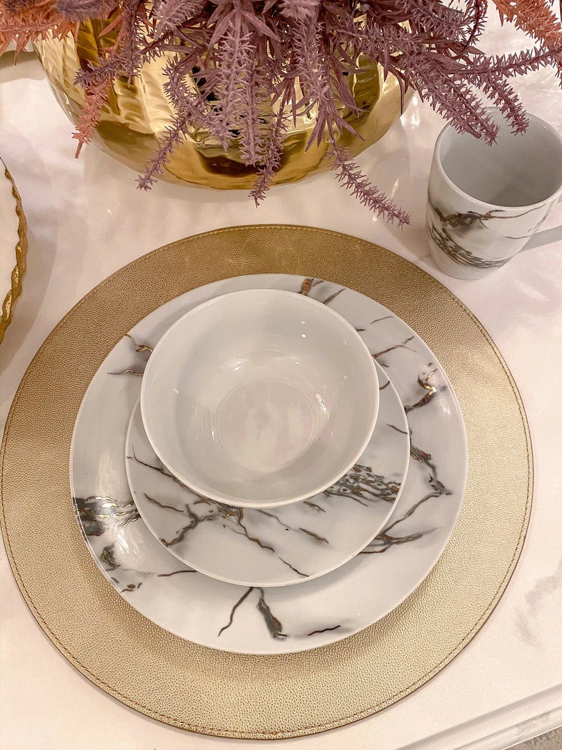 This ceramic marble dining set will take each meal to the next level with beauty and elegance. Featuring a faux metallic marble veining!