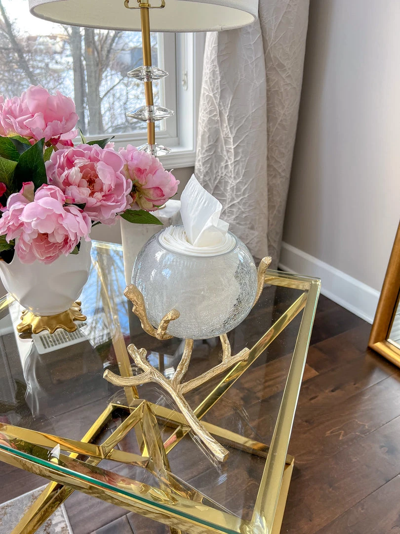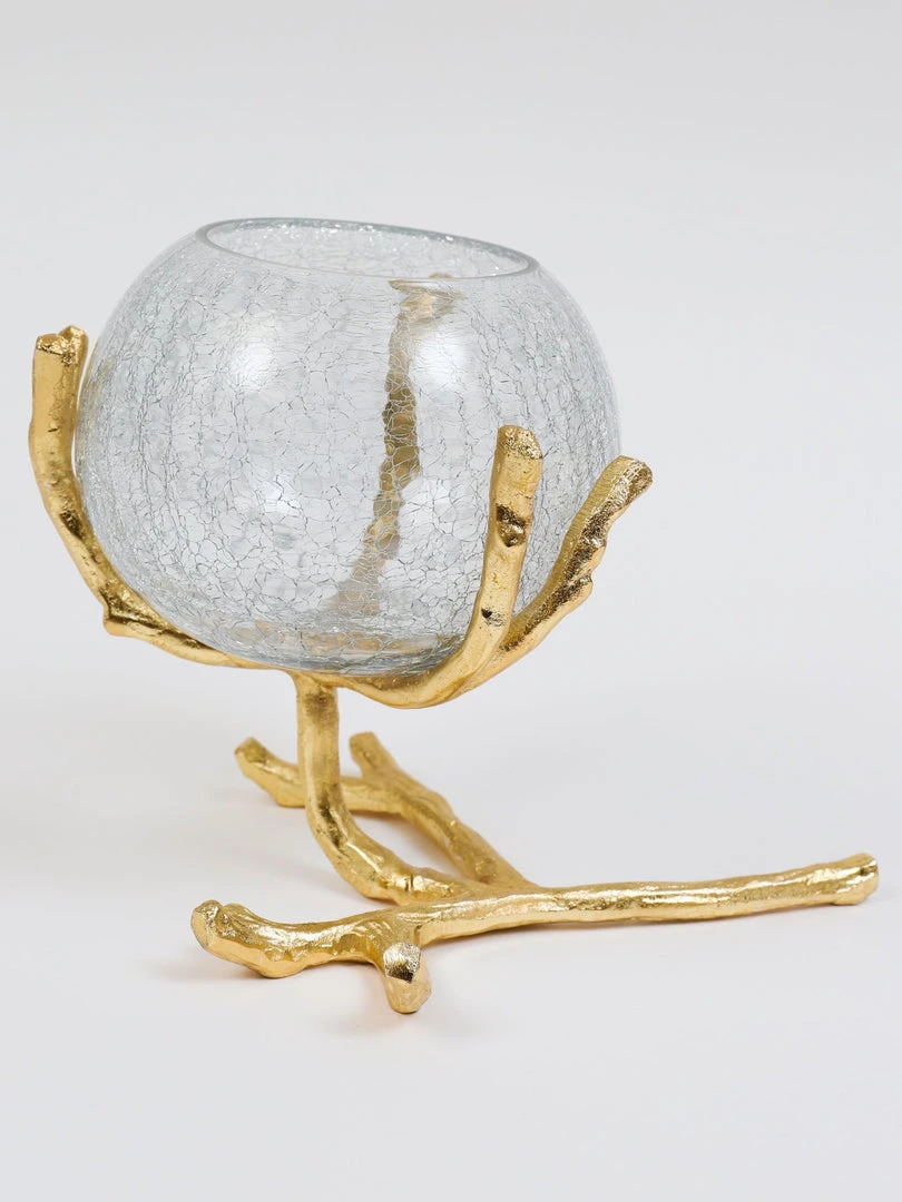 Description: Available in silver and gold, this beautiful piece is so versatile. It is sure to add some delight and whimsy to your home! The metal branch stands rests with a large crackled glass bowl to perfectly capture the light of your favorite candles or house beautiful floral arrangements as well! This makes the perfect tissue holder but is elegant and adds some style.