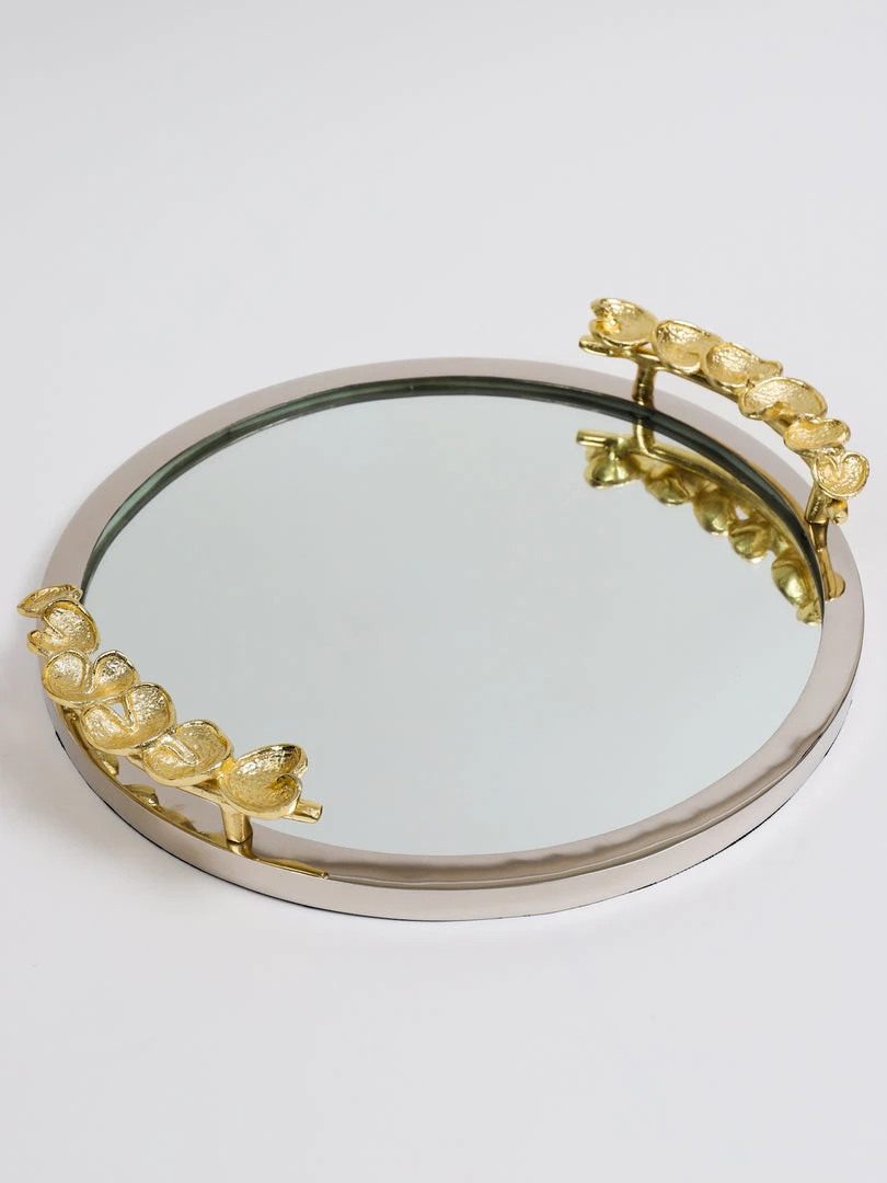Description: This round tray mirror has a gold petal handle design and will look great as a vanity mirror or a layering piece on your coffee table!