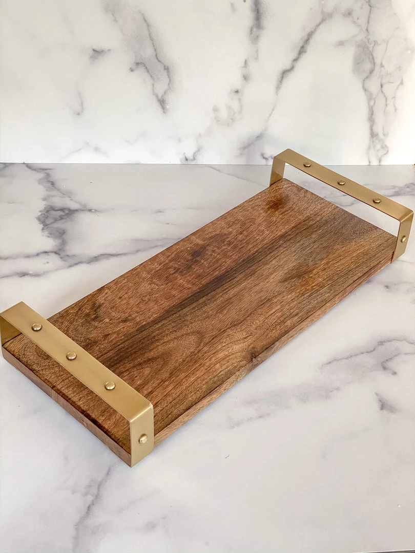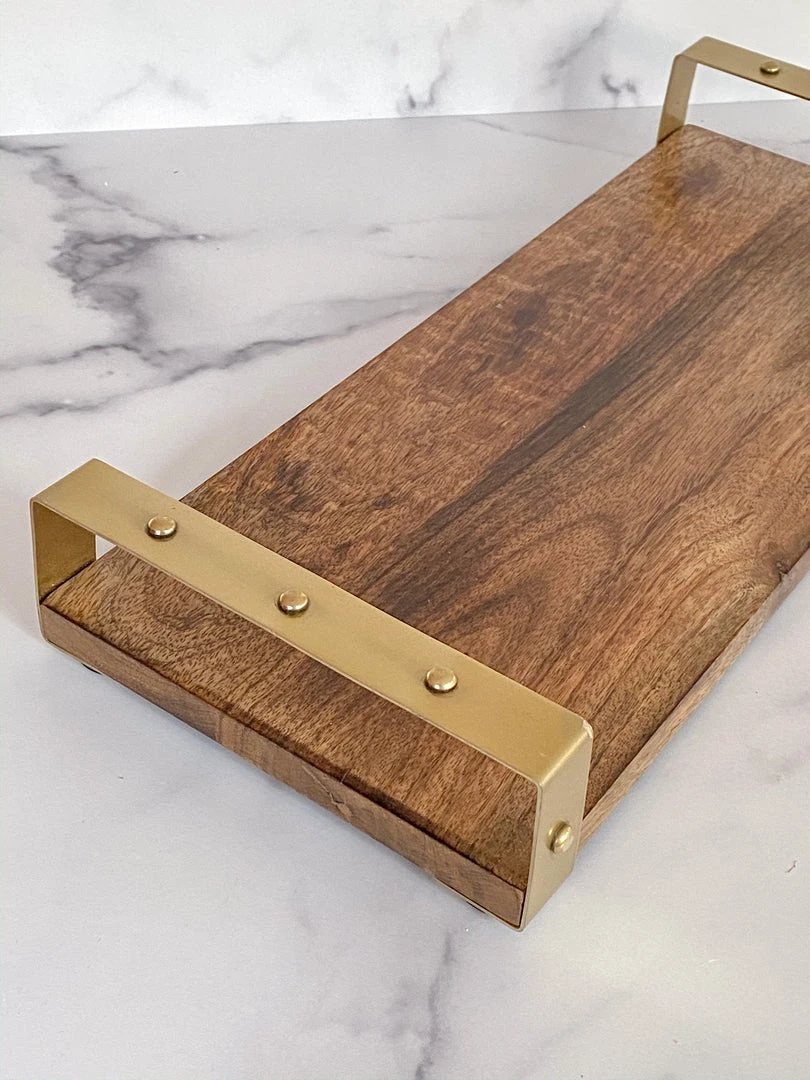 This dark wooden tray features nice gold beaded handles and is perfect for fall! Ties back perfectly to our larger wood trays as wel!