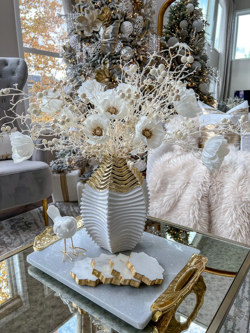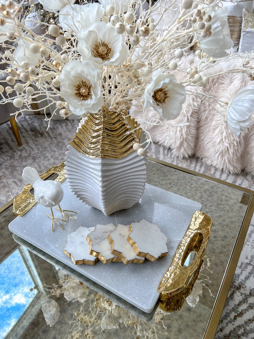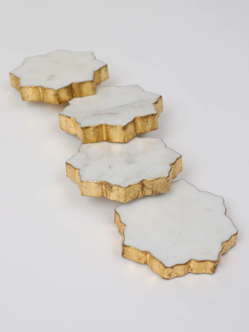 Description: This beautiful set of 4 lotus-shaped Marble coasters featuring a gold edge will look stunning wherever you place them.
