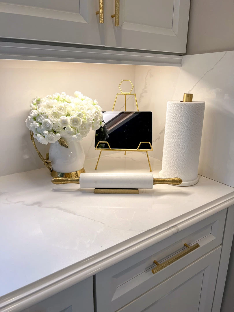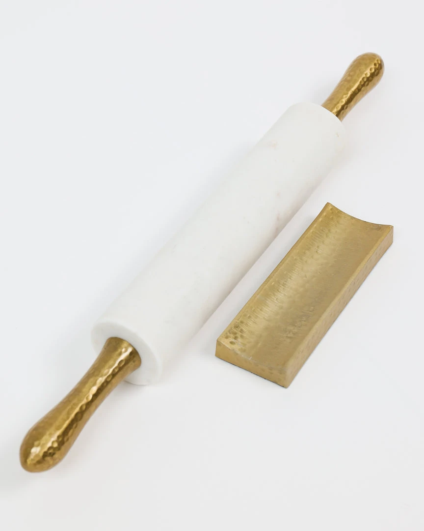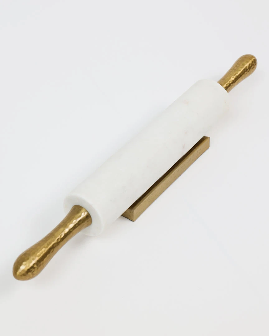 Description: This gorgeous marble rolling pin with gold hammered textured handles and base is so stylish. Perfect for using in baking or just makes the most beautiful display!