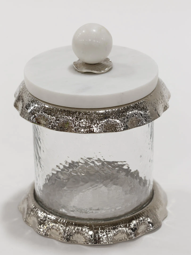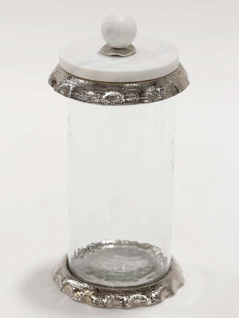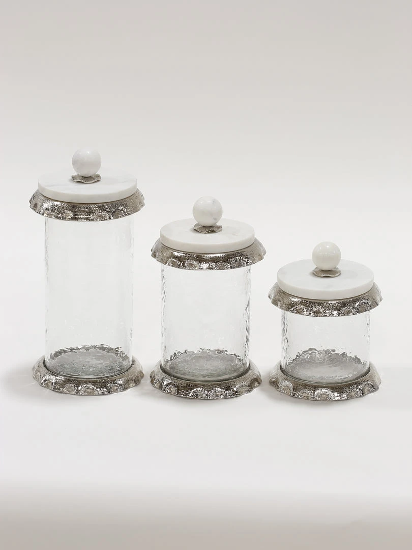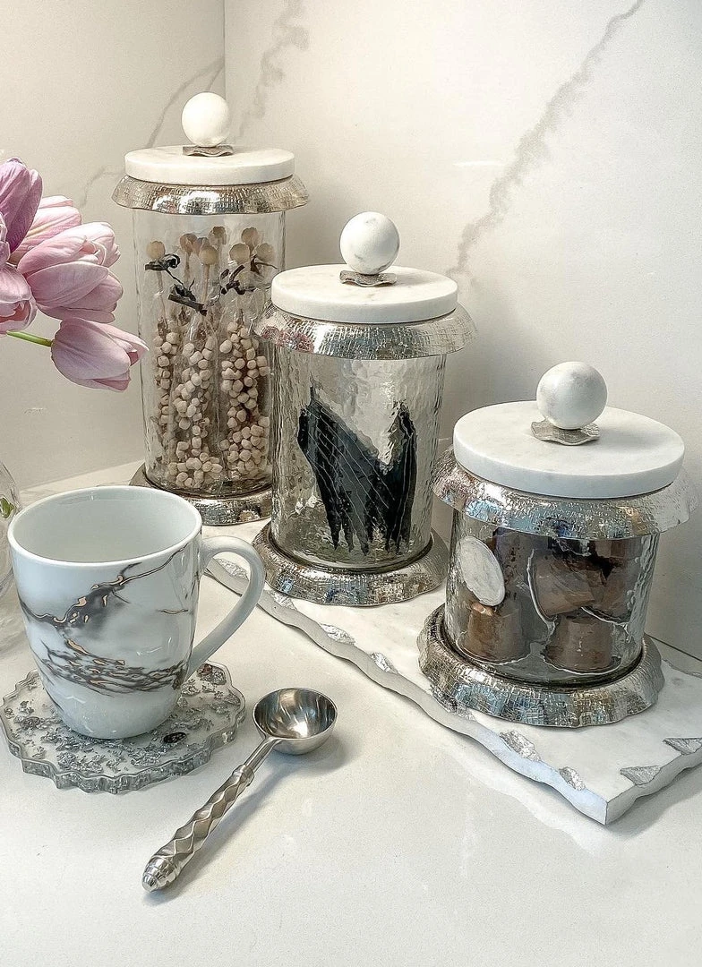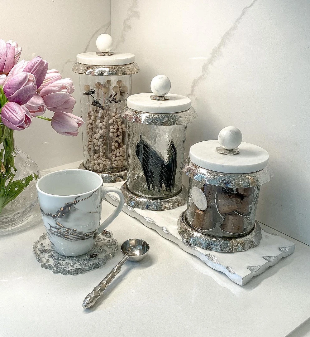 Beautiful glass container with real marble lid great for storing snacks, treats and anything that fits in the variety of three sizes!