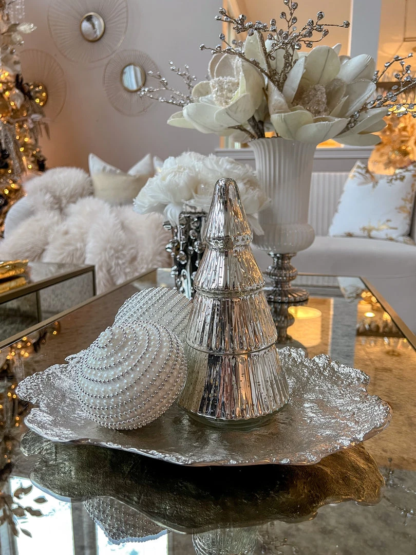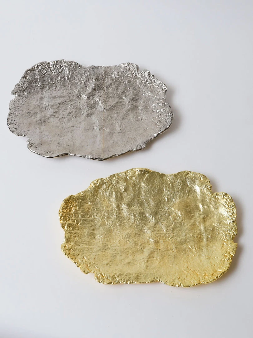 Description: Style your favorite vase, candles or decor on this gorgeous textured rough edge tray for a beautiful vignette. Available in gold and silver.