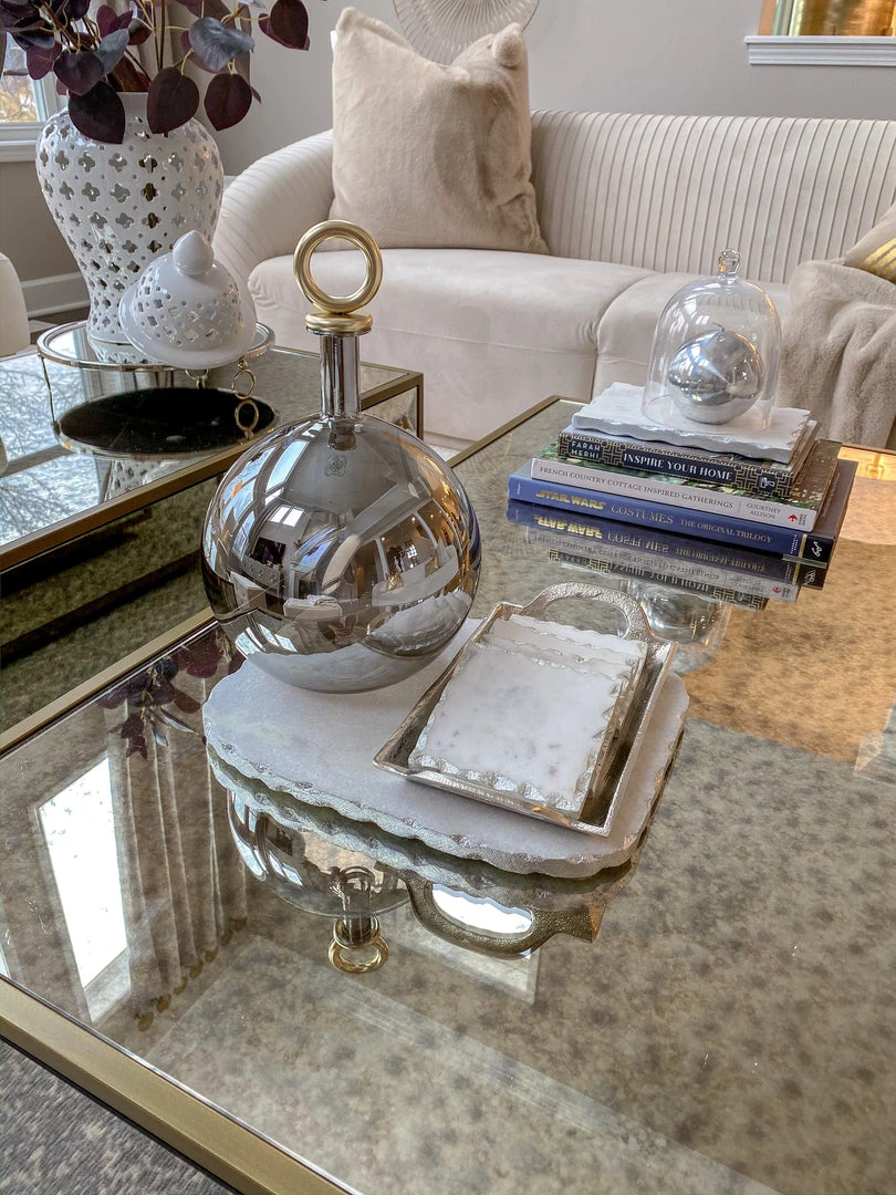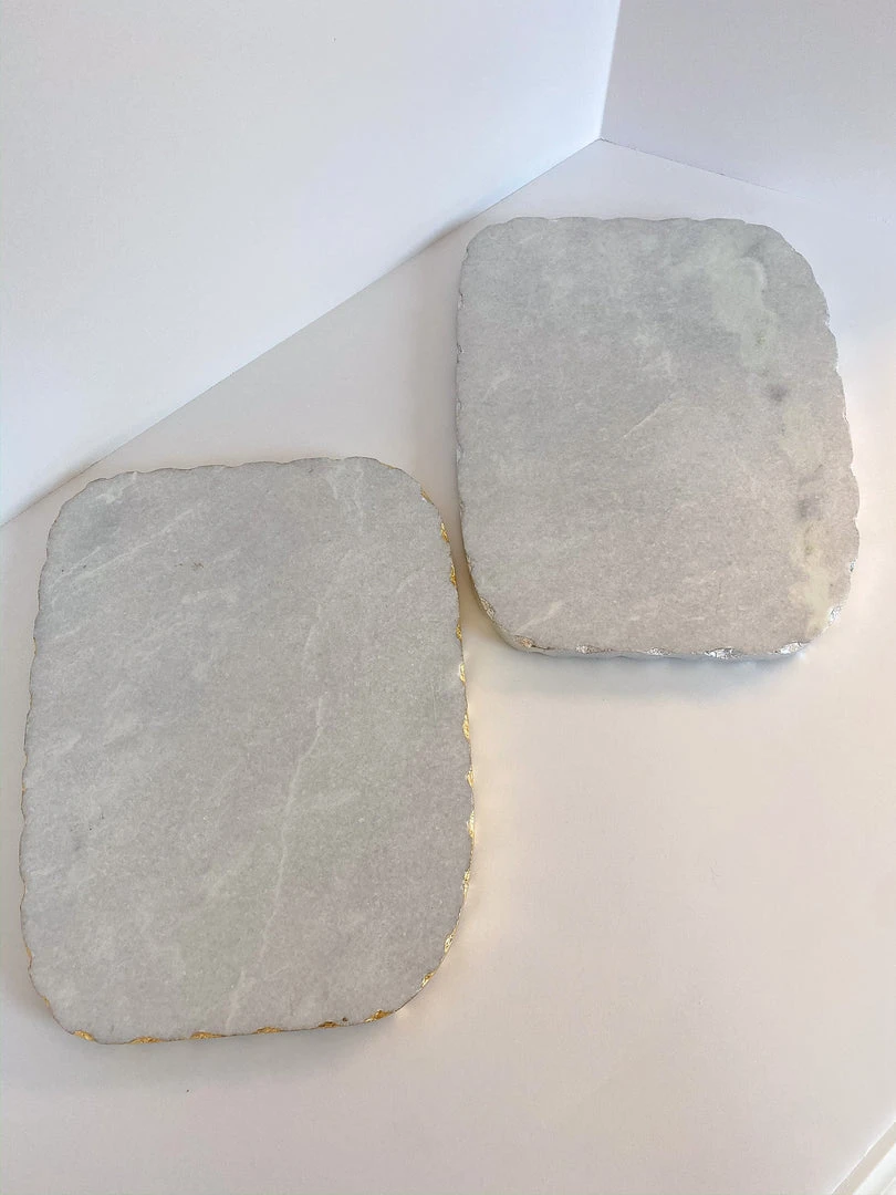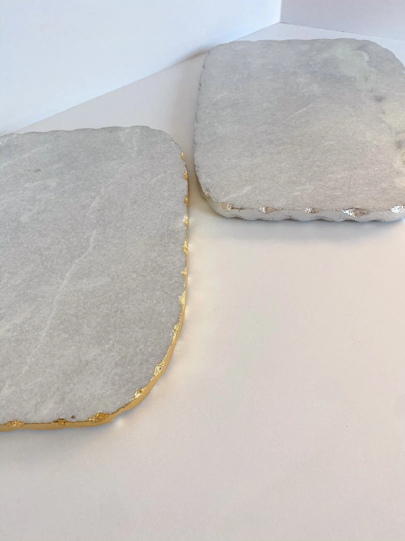 Description: Create a beautiful spread with this beautful marble cheese board! Available silver and gold trims!
